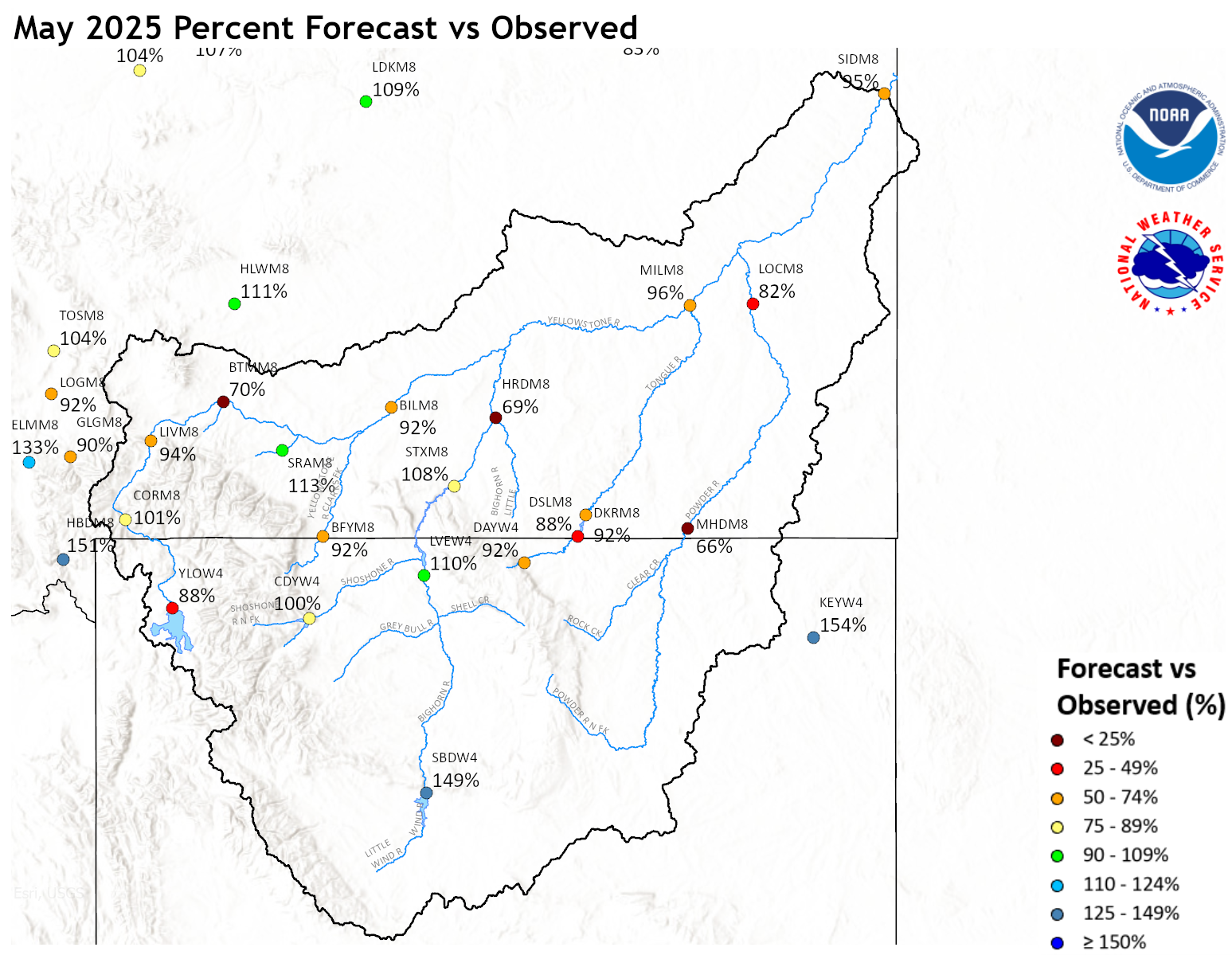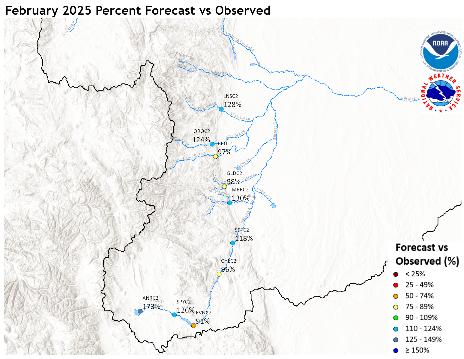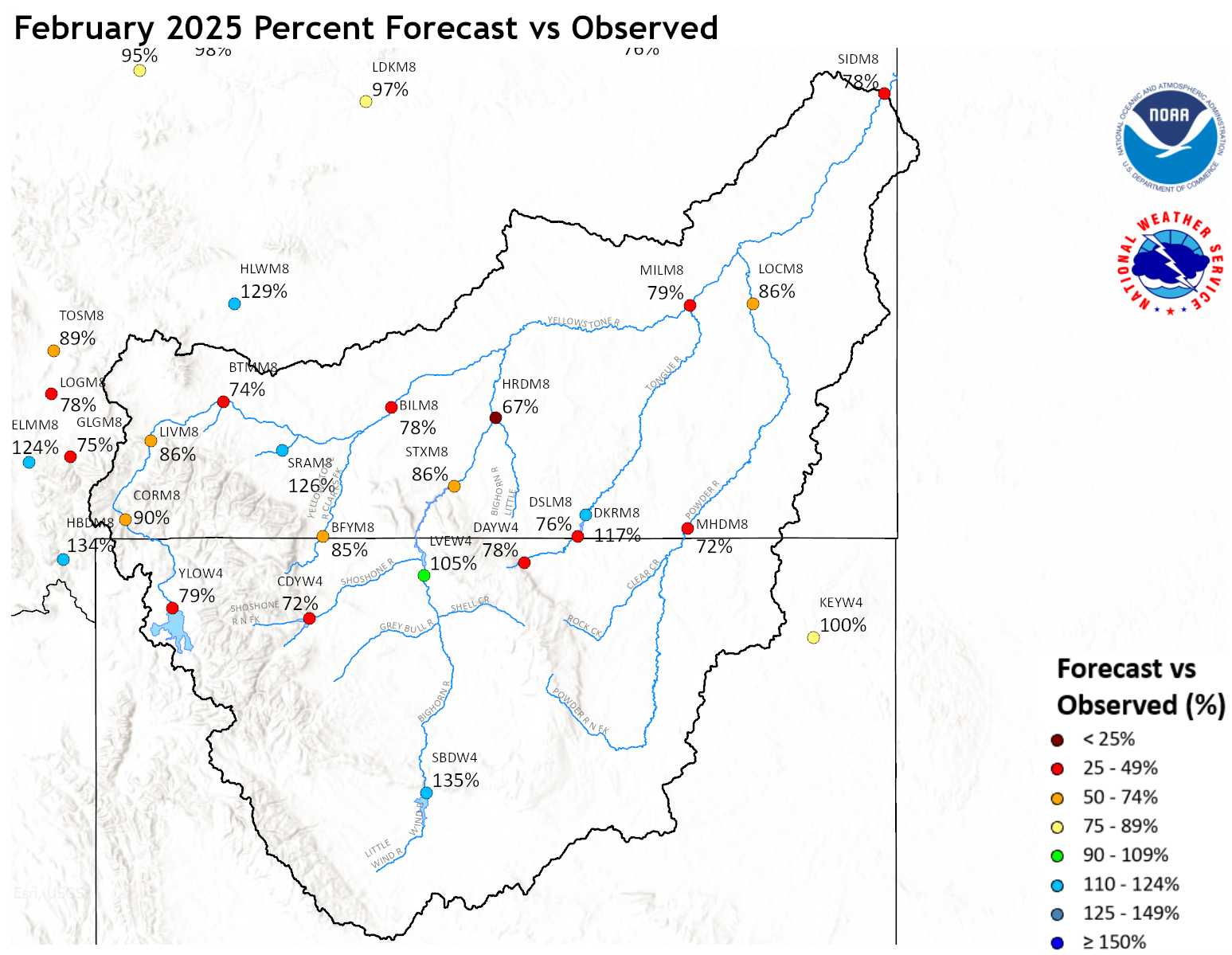 The following are water supply verification graphics that compare the forecasted April - September (seasonal) forecasted volumes to the observed volumes. Seasonal runoff volumes are forecast each January, February, March, April, May and June. The verification graphics are displayed as a percentage and are calculated as the Forecasted Volume / Observed Volume. For example 125% would mean that the forecasted volume for that forecast would be 25% more than what occurred, and similarly 75% would mean that the forecasted volume for that forecast would be 25% less than what occurred.  |
