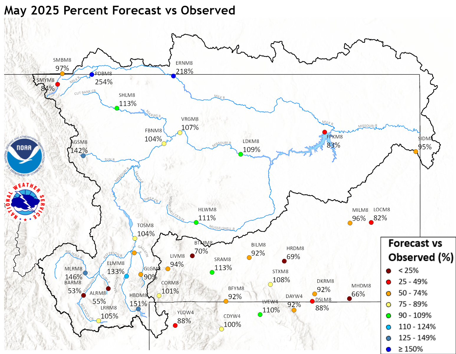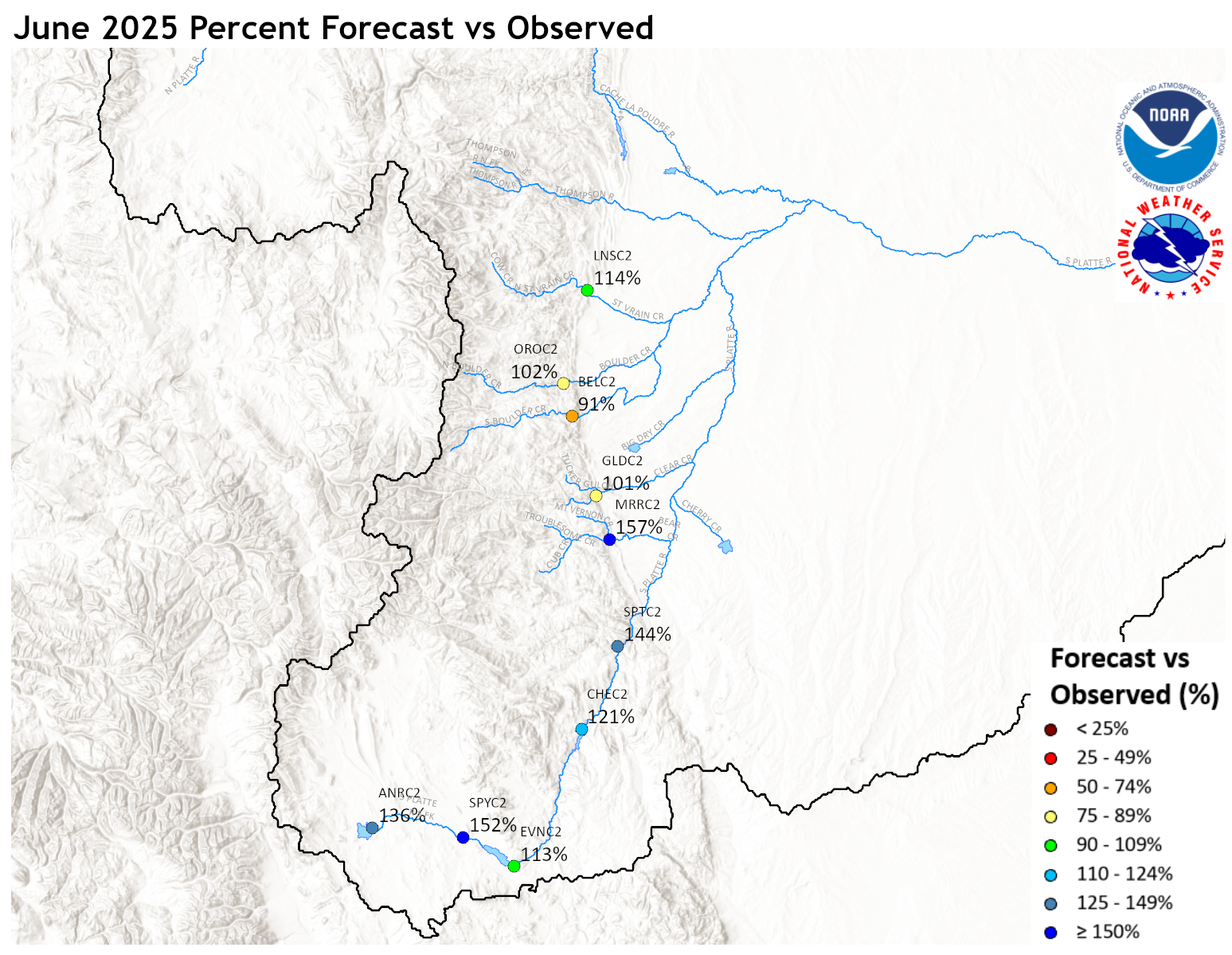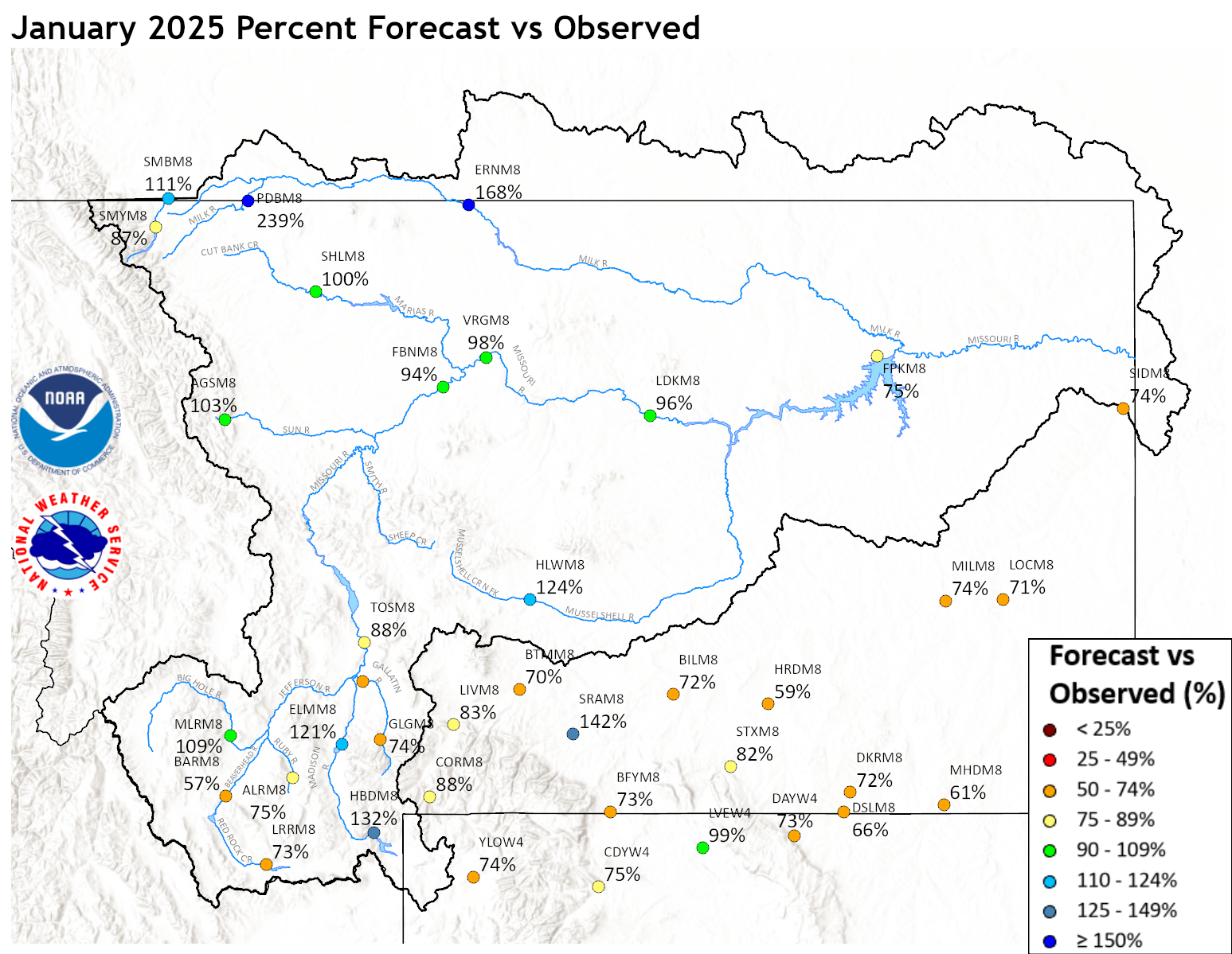 The following are water supply verification graphics that compare the forecasted April - September (seasonal) forecasted volumes to the observed volumes. Seasonal runoff volumes are forecast each January, February, March, April, May and June. The verification graphics are displayed as a percentage and are calculated as the Forecasted Volume / Observed Volume. For example 125% would mean that the forecasted volume for that forecast would be 25% more than what occurred, and similarly 75% would mean that the forecasted volume for that forecast would be 25% less than what occurred.  |