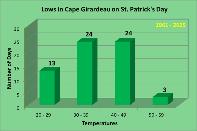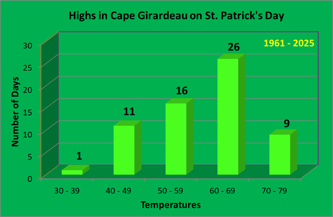 Here is a look at high and low temperature frequencies and extremes as well as precipitation statistics for St. Patrick's Day in Cape Girardeau.