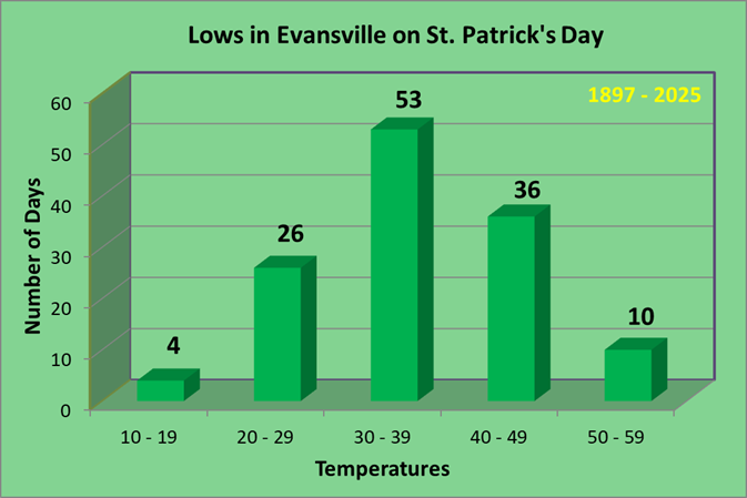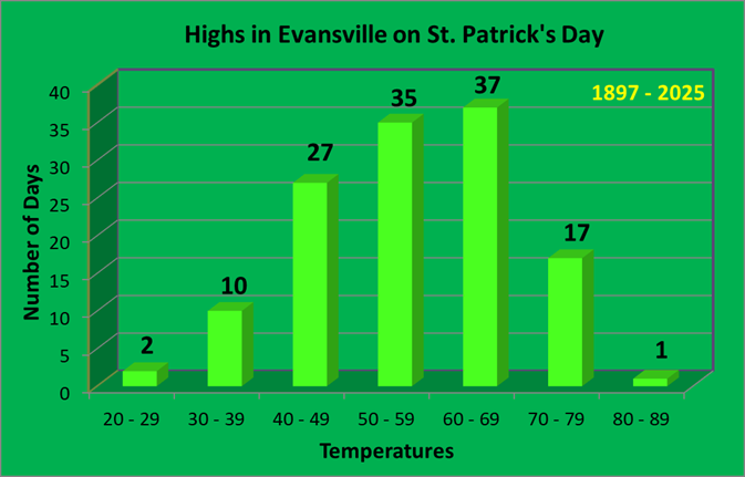 Here is a look at high and low temperature frequencies and extremes as well as precipitation statistics for St. Patrick's Day in Evansville.