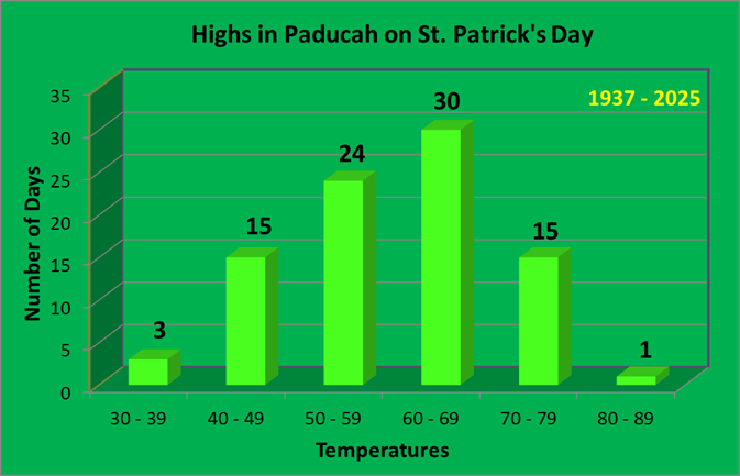 Here is a look at high and low temperature frequencies and extremes as well as precipitation statistics for St. Patrick's Day in Paducah.