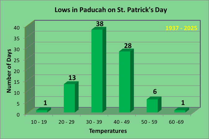 Paducah has seen highs surge above 80 degrees only once on St. Patricks Day, way back in 1945. There have also been 3 years where the high temperature failed to reach 40 degrees. This last occurred in 1970 when the high only made it up to 37 degrees!