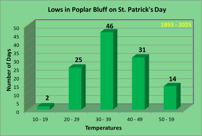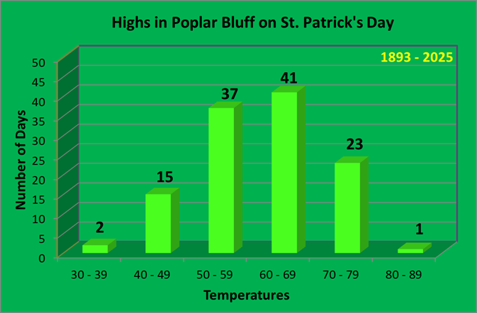 Here is a look at high and low temperature frequencies and extremes as well as precipitation statistics for St. Patrick's Day in Poplar Bluff.