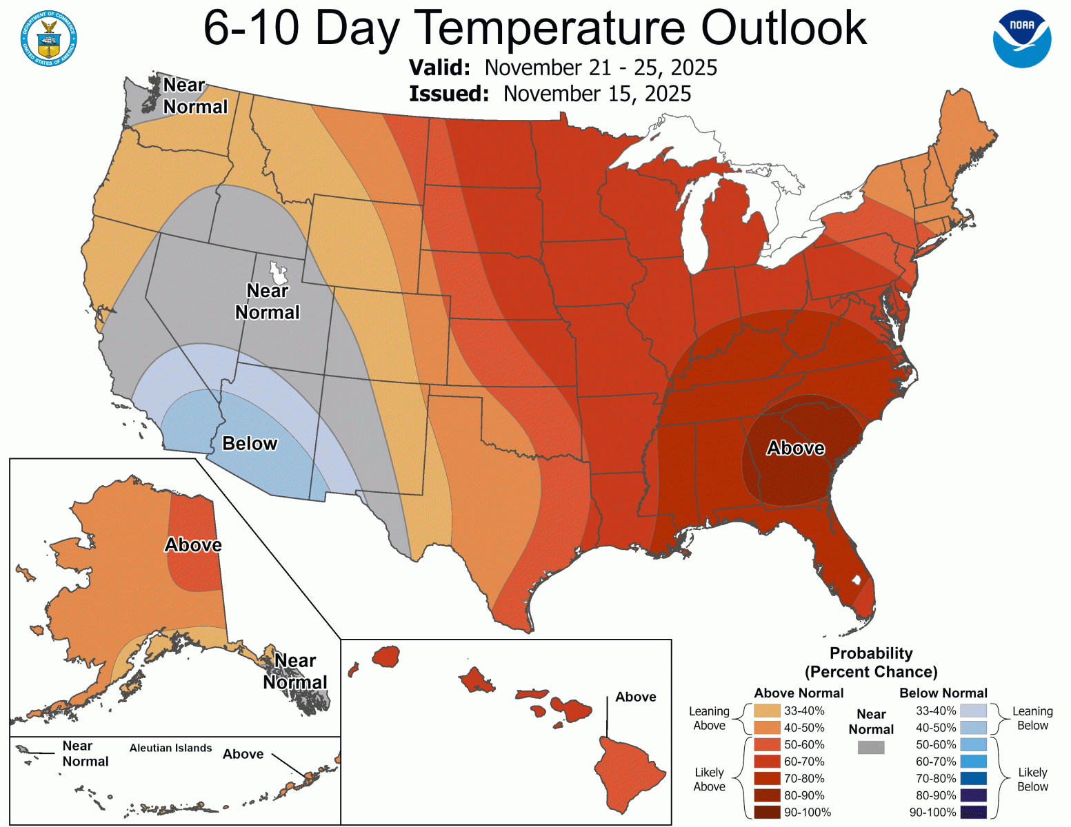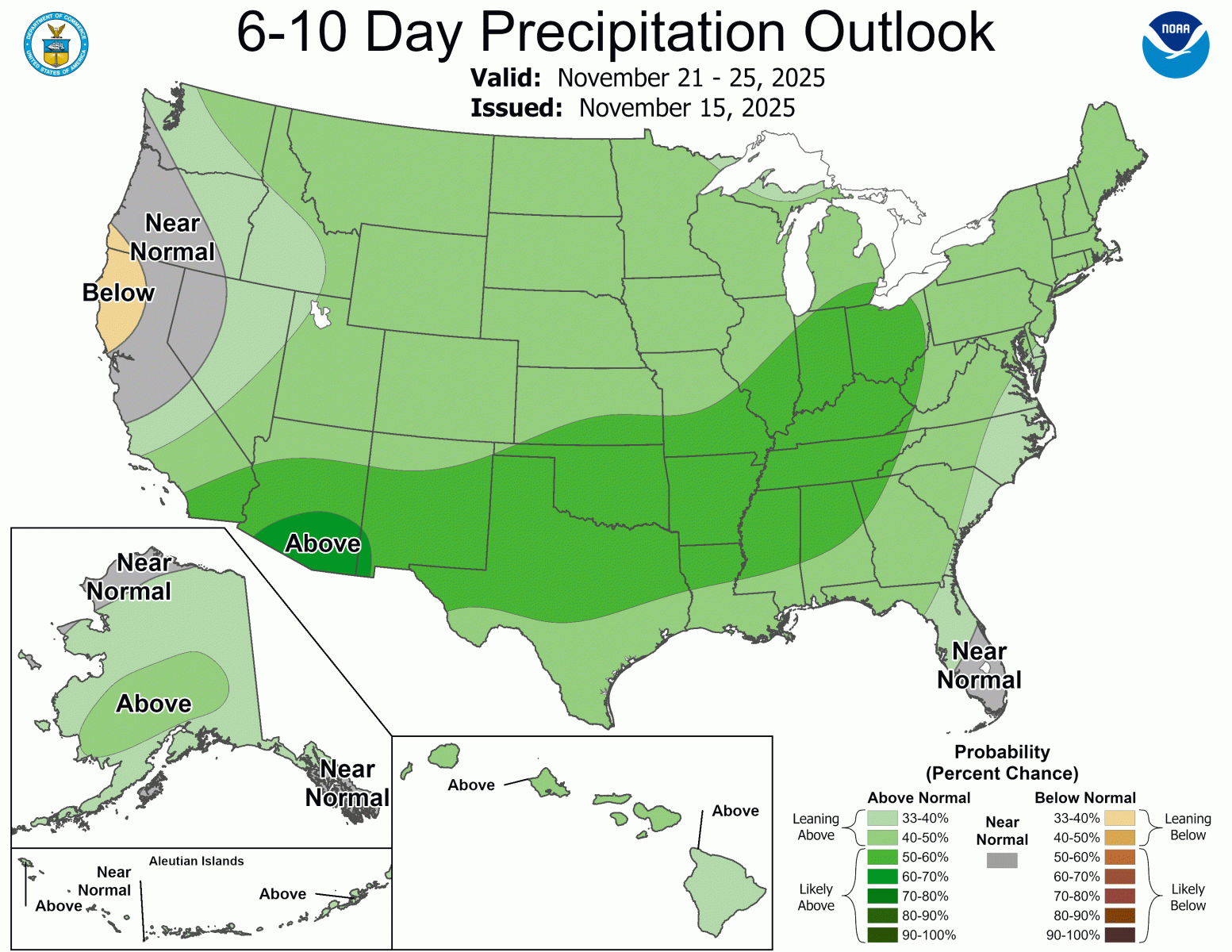 The latest 6-10 day outlooks (Nov 21-25) from the Climate Prediction Center (CPC) suggest ABOVE normal temperatures and ABOVE normal precipitation across central Illinois.