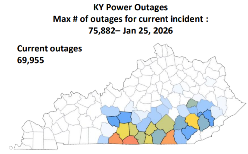 Summary of Impacts to the Region: - Federal Disaster Declaration on January 23rd, 2026 ahead of the weather event. Kentucky State Emergency Operations Center activated to Level 2 on the morning of January 24th. - Power outages across southern, central, and eastern Kentucky peaked around 75,000 on Sunday afternoon, mostly from freezing rain/ice impacts. - Every county in the state of Kentucky was put under a Winter Storm Warning. - 65,000 personnel from 43 states and Canada were pre-positioned to assist with utility restoration ahead of the storm. - During the peak of the weather event, over 350 resource requests had been received by the Kentucky State Emergency Operations Center. - 109 counties across Kentucky declared a State of Emergency. - 136 Shelters were opened across the state of Kentucky. - 937 people used warming shelters at the peak of the event. - 1 confirmed fatality resulting from cold impacts following the winter weather. |