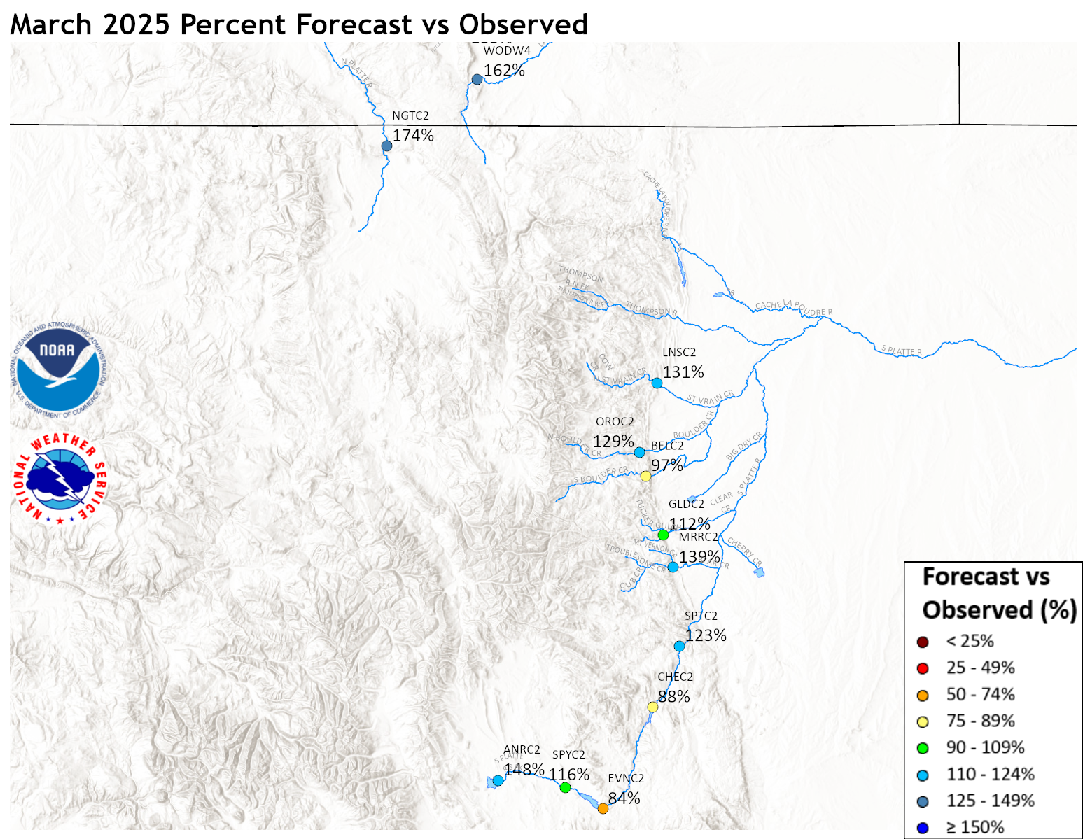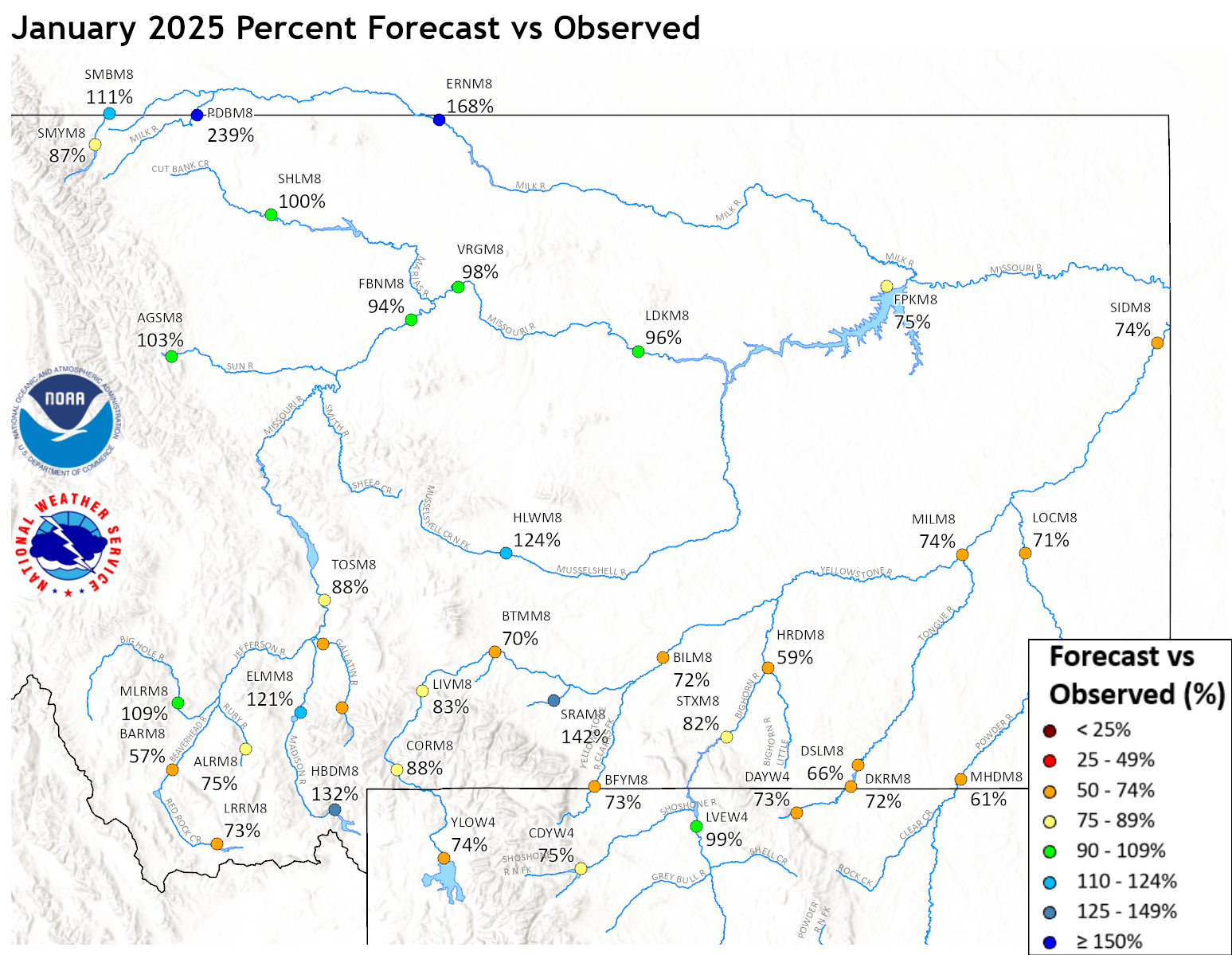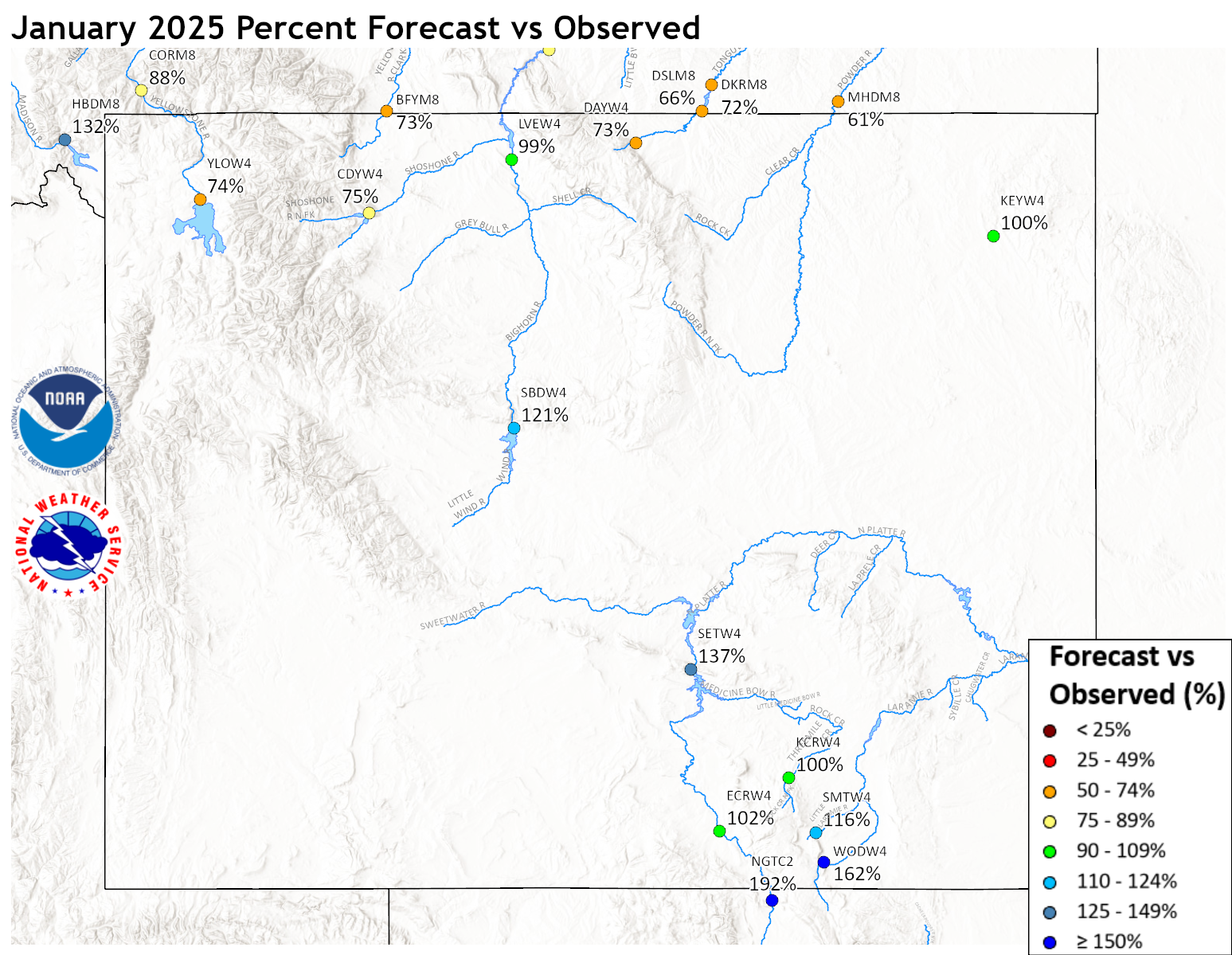The following are water supply verification graphics that compare the forecasted April - September (seasonal) forecasted volumes to the observed volumes. Seasonal runoff volumes are forecast each January, February, March, April, May and June. The verification graphics are displayed as a percentage and are calculated as the Forecasted Volume / Observed Volume. For example 125% would mean that the forecasted volume for that forecast would be 25% more than what occurred, and similarly 75% would mean that the forecasted volume for that forecast would be 25% less than what occurred. |
