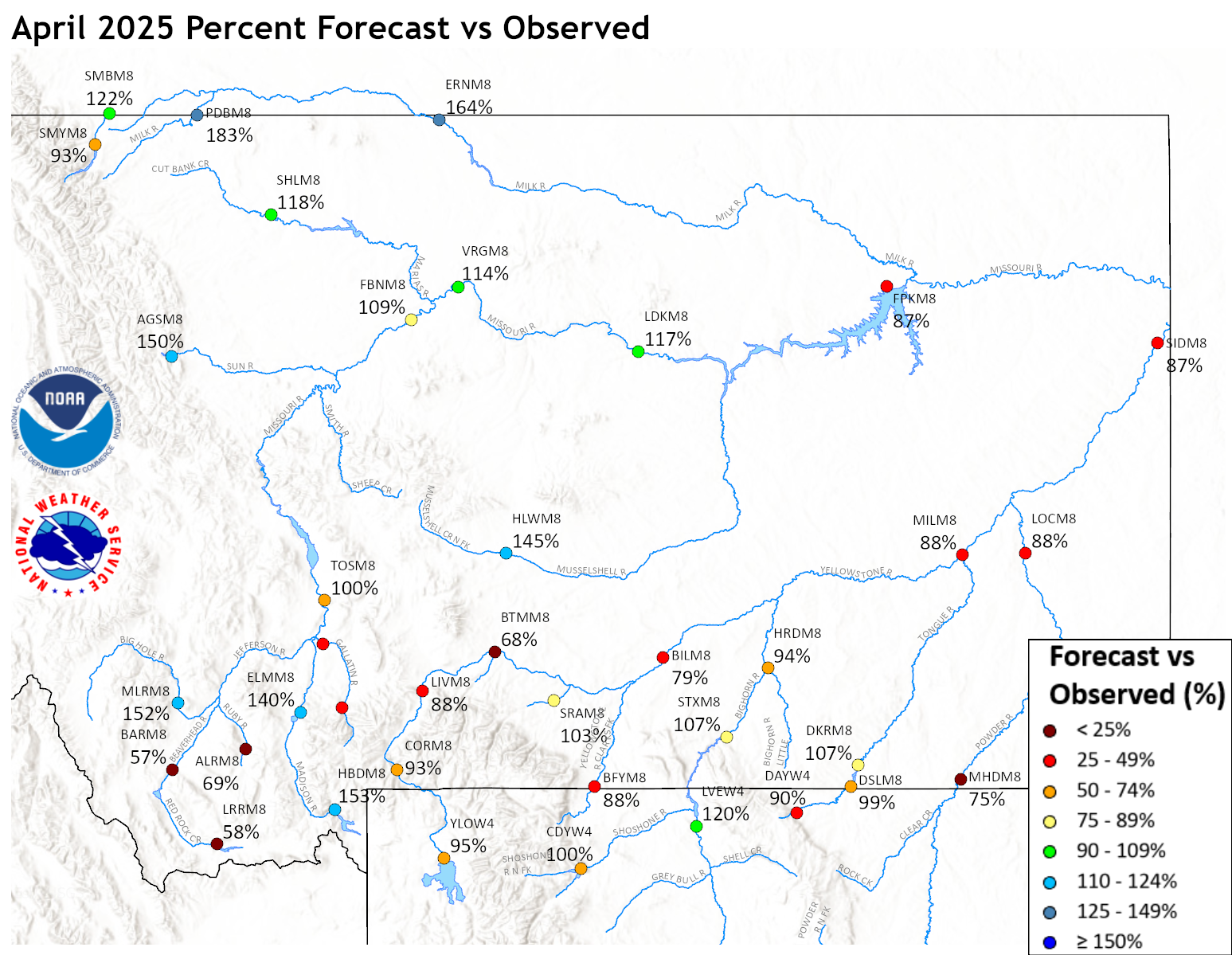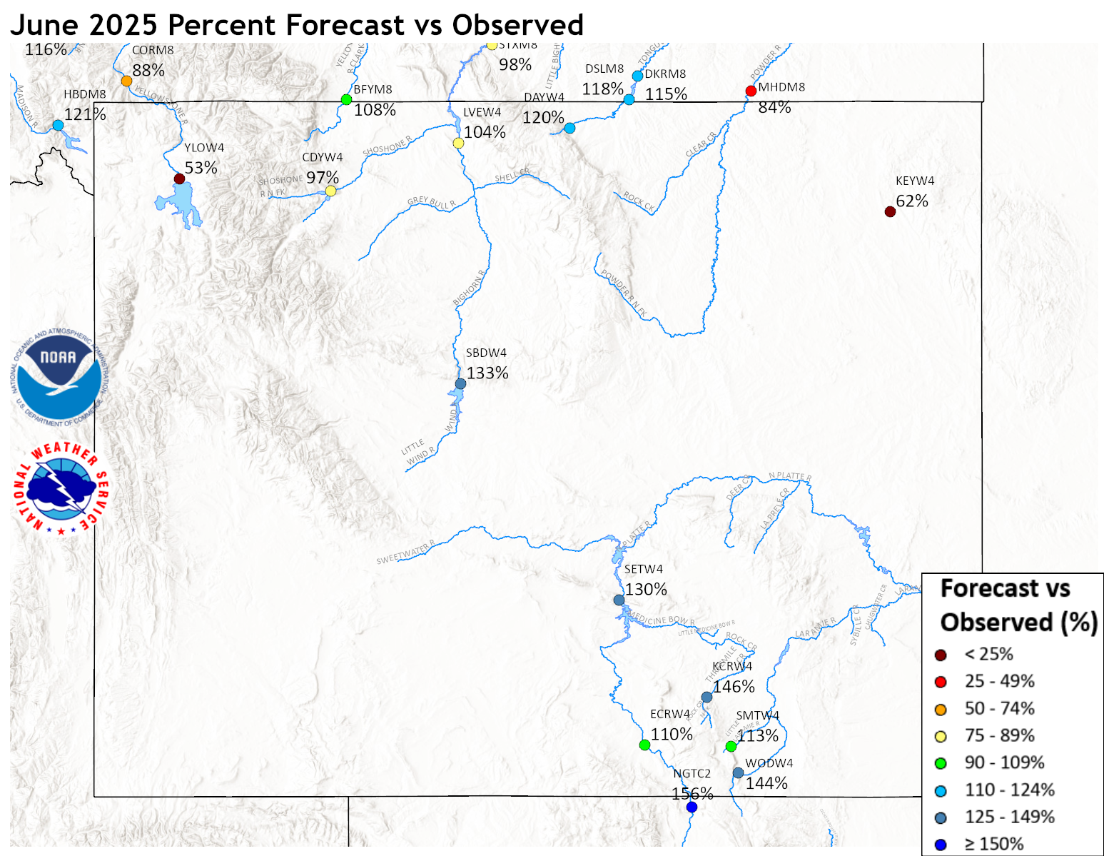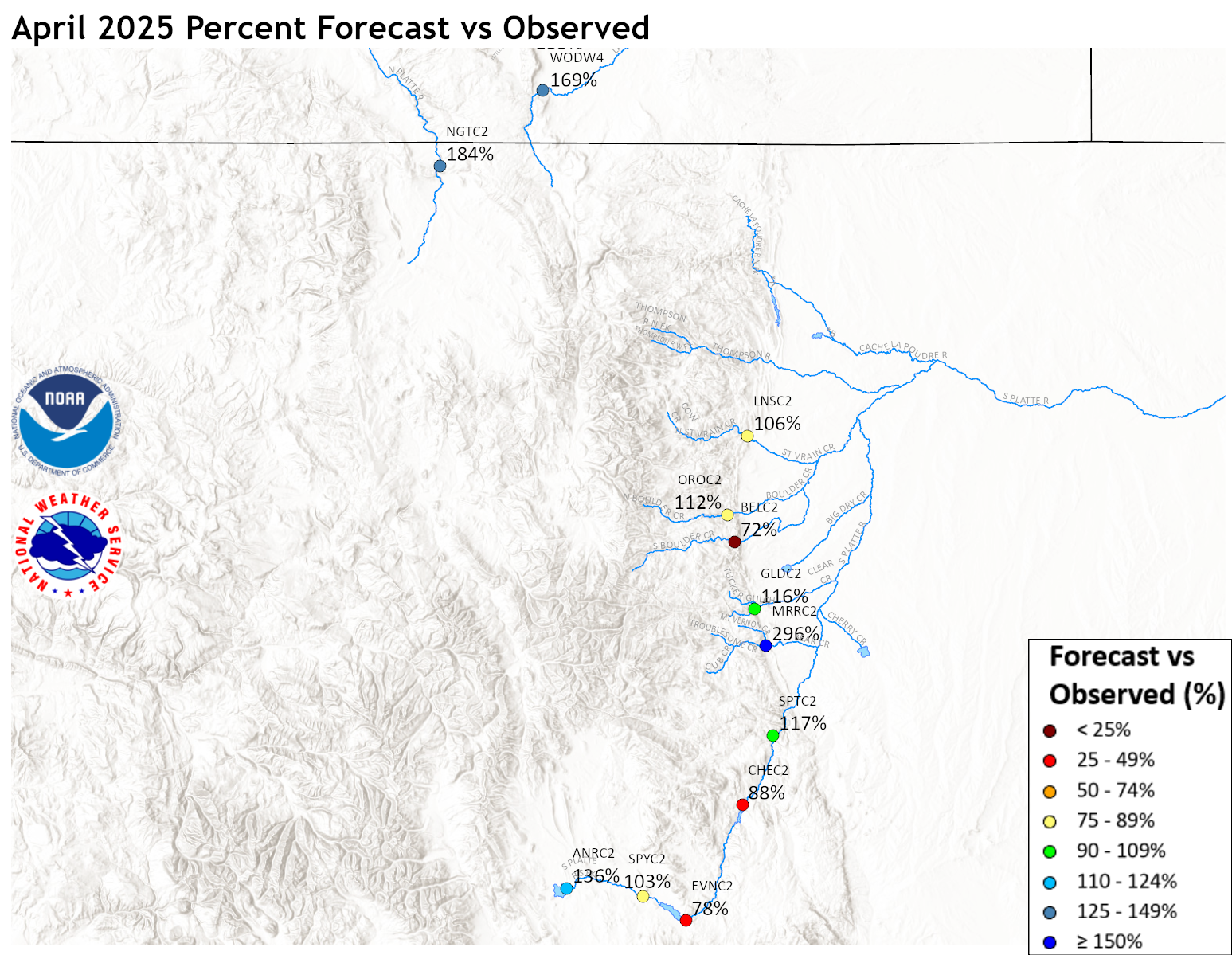 The following are water supply verification graphics that compare the forecasted April - September (seasonal) forecasted volumes to the observed volumes. Seasonal runoff volumes are forecast each January, February, March, April, May and June. The verification graphics are displayed as a percentage and are calculated as the Forecasted Volume / Observed Volume. For example 125% would mean that the forecasted volume for that forecast would be 25% more than what occurred, and similarly 75% would mean that the forecasted volume for that forecast would be 25% less than what occurred. |