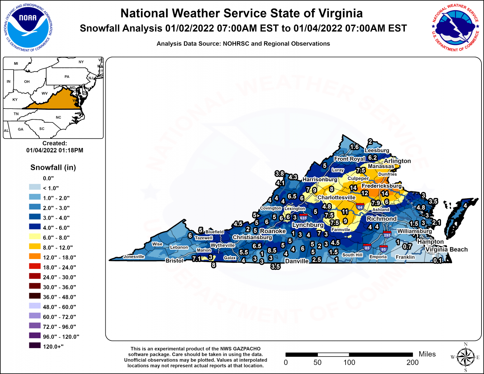 The most dangerous winter weather systems for Virginia, which can produce major amounts of snow and ice, are strong coastal low pressure systems known as nor'easters. These types of storms can impact the region a couple times a season and when the temperatures are cold enough, these types of storms can produce big snowfall events. For example, the winter storm of January 3, 2022, was a high-impact event that affected a large portion of Virginia. Temperatures were in the 60s across much of the Commonwealth before snow began falling during the early morning hours of January 3rd. Snow continued through much of the day with rates of 1 to 2+ inches per hour for several hours during the peak of the storm. This allowed snow to quickly accumulate on all area roadways, including on I-95. A widespread 8 to 14 inches of heavy, wet snow fell across the central Virginia Piedmont, Northern Neck, and into portions of Northern Virginia. 3 to 6 inches fell in most of the Richmond Metro area, with little to no snow across southeast portions of the Commonwealth.