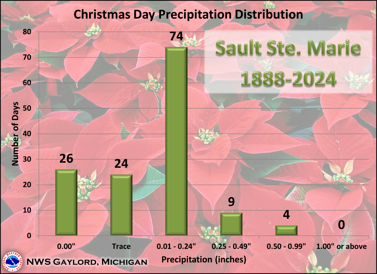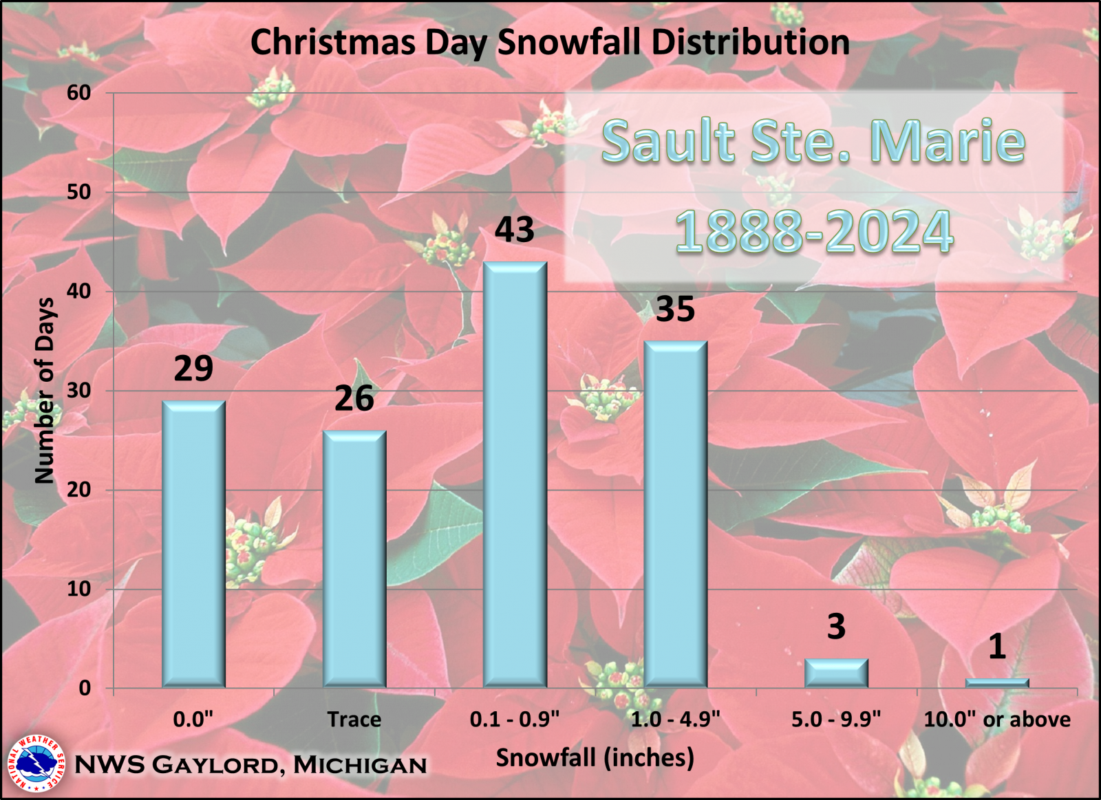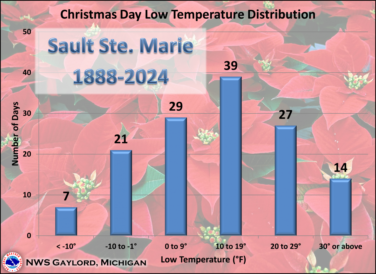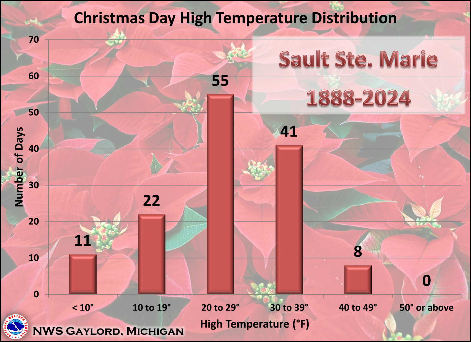 Here is a look at some Christmas Day weather statistics for Sault Ste. Marie, with data going back to 1888. As can be seen in the data below, there has been a wide spectrum of temperatures and precipitation on Christmas Day in Sault Ste. Marie, but highs have generally been in the 20s and lows in the teens. It is also quite common for Sault Ste. Marie to see measurable snow on Christmas Day. Scroll to the bottom of the page to find out how common a white Christmas is in the Sault Ste. Marie area. |