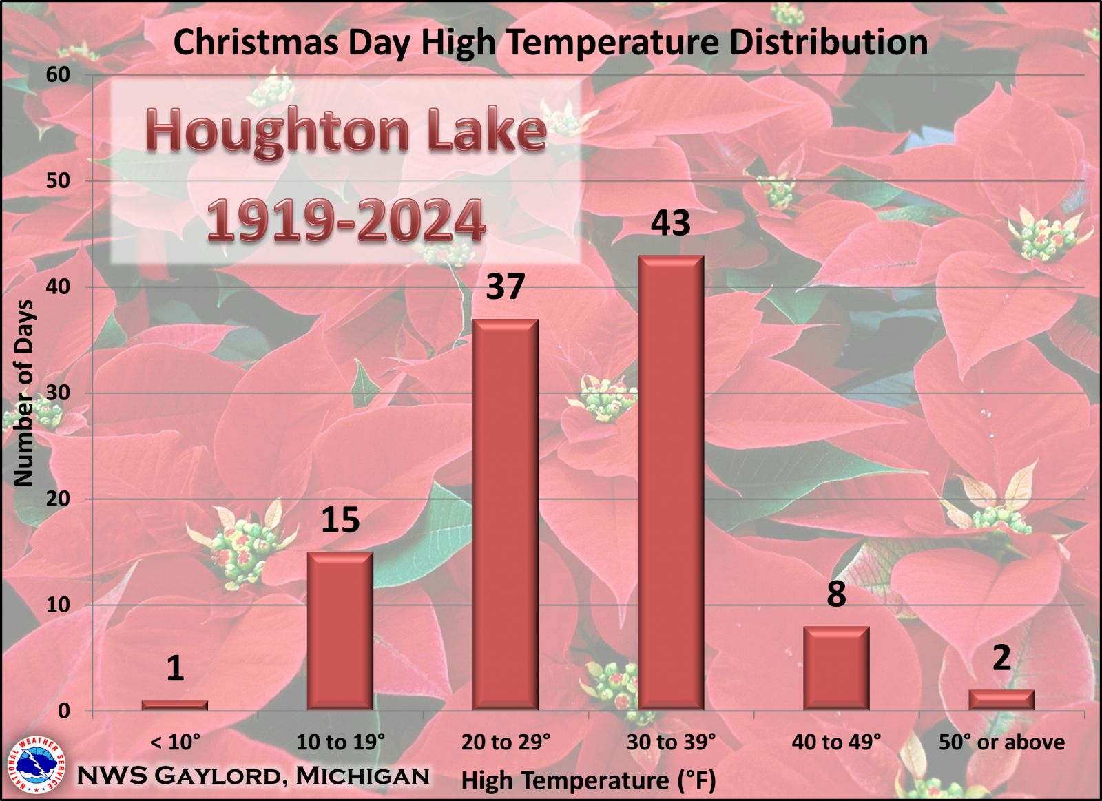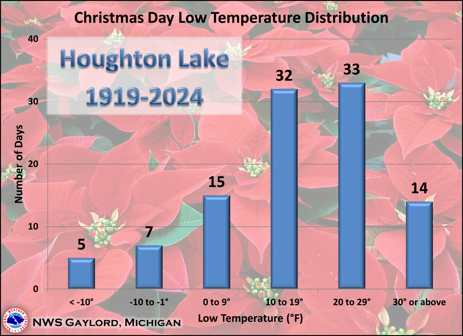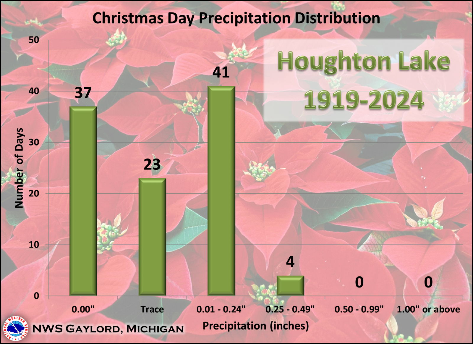 Here is a look at some Christmas Day weather statistics for Houghton Lake, with data going back to 1919. As can be seen in the data below, there has been a wide spectrum of temperatures and precipitation on Christmas Day in Houghton Lake, but highs have generally been in the 20s/30s and lows in the teens/20s. It is also somewhat common for Houghton Lake to see measurable snow on Christmas Day. Scroll to the bottom of the page to find out how common a white Christmas is in the Houghton Lake area. |