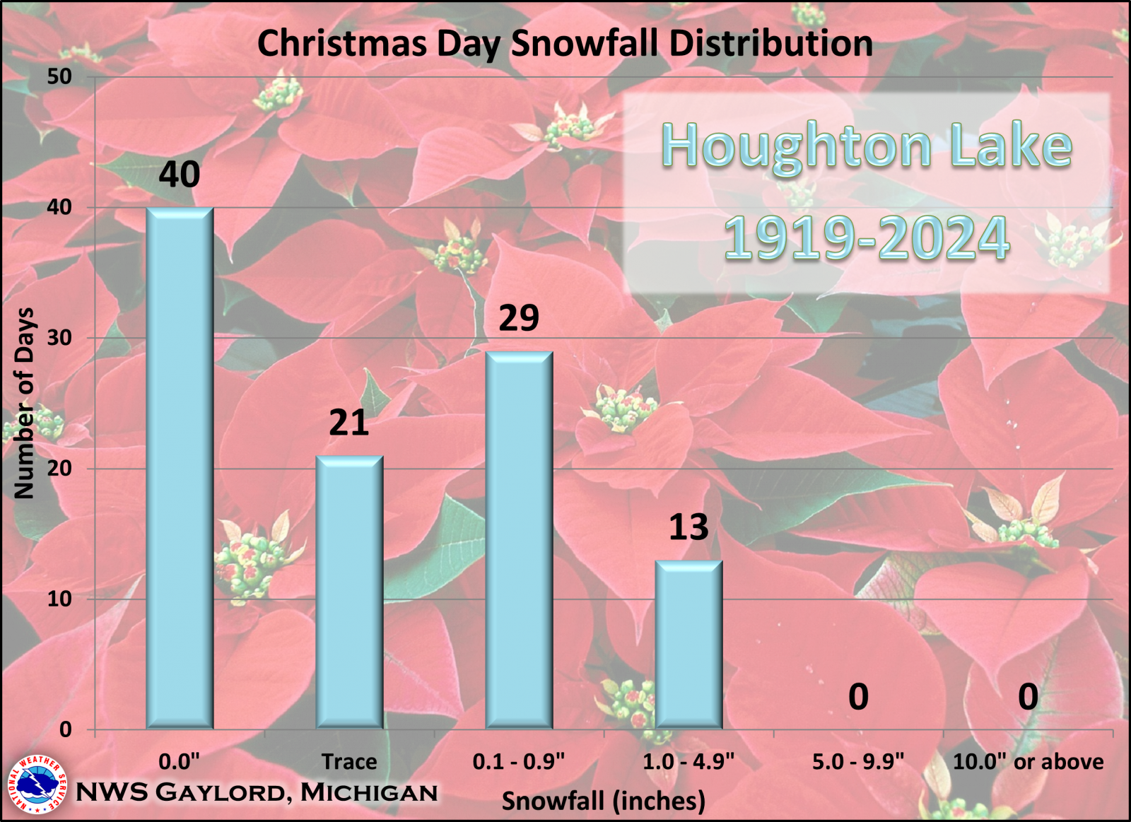 A "white Christmas" is defined as having an inch or more of snow on the ground on Christmas morning. How common is that in the Houghton Lake area? Since snow depth measurements began in Houghton Lake in 1919, the area has experienced a white Christmas 82 times, or about 82% of the time.