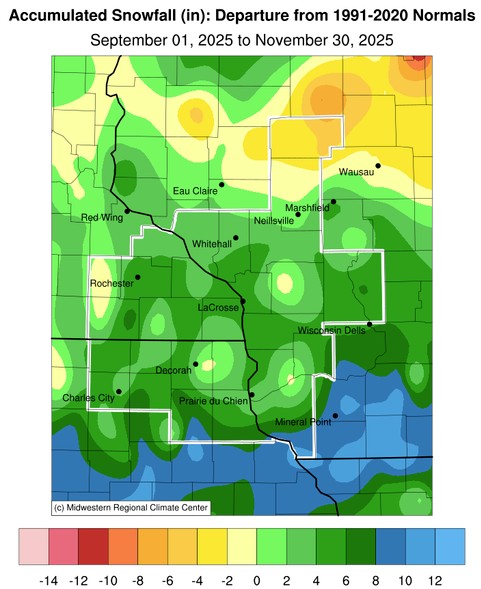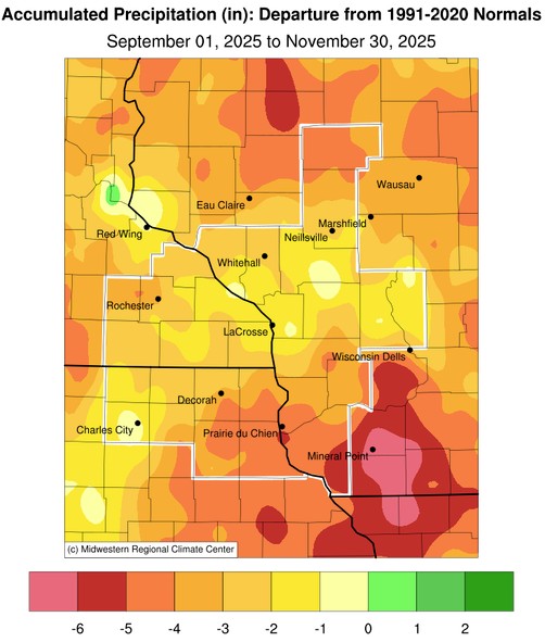 Meteorological Autumn of 2025 was much warmer (11th warmest) and drier than normal in La Crosse, WI. More details can be found below.