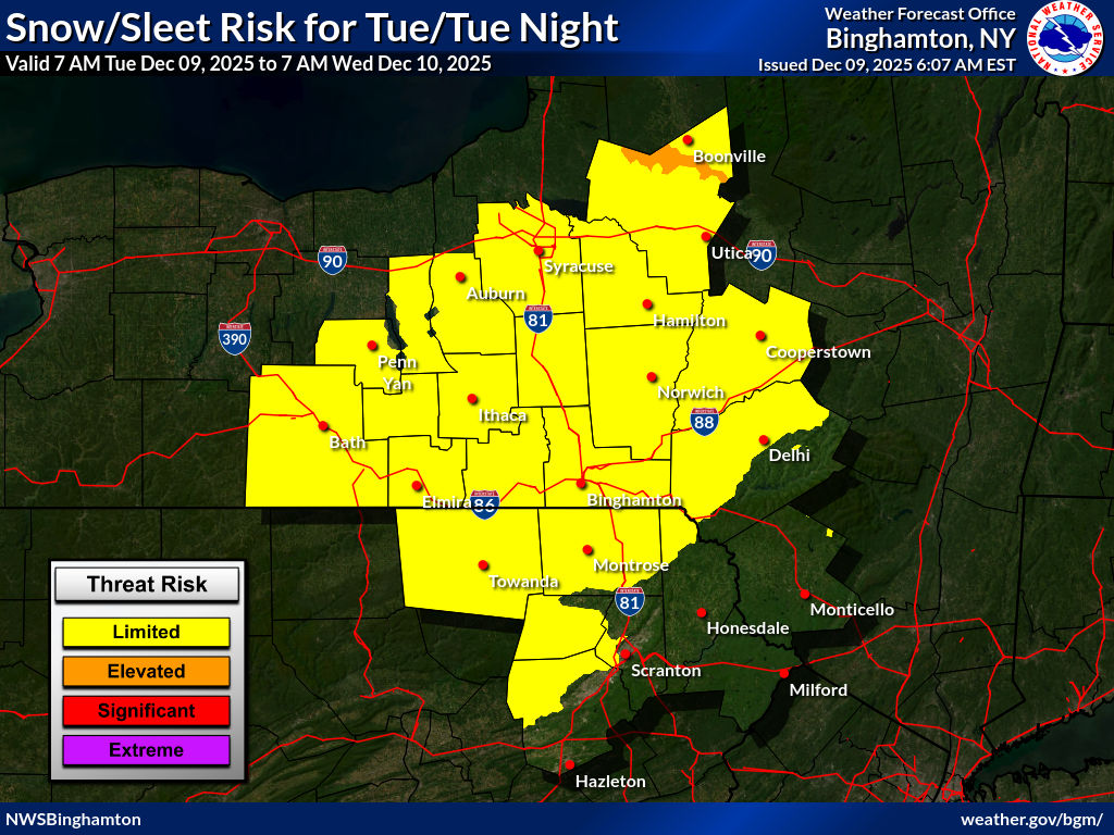 NWS Binghamton weather forecasts, briefings and warnings are for the area show on the map below, this includes 17 counties in New York and 7 counties in Pennsylvania. This includes the cities of Elmira,Ithaca, Rome,Syracuse, Utica, and Scranton and Wilkes-Barre, to name a few.