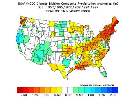 If we take a composite of those years for October, what we find is that Octobers tended to be drier than normal. Looking at the graphic below, you can see that Central Alabama tended to have rainfall on the order of one-half to one inch below normal for the month.