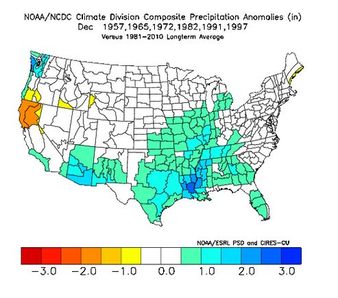 Finally, as we move into December for these years, we see that rainfall increases across Central Alabama, with amounts generally averaging up to over an inch above normal.