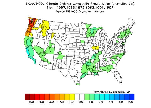 Next, let’s see how Novembers shaped up in general. Looking at the composite graphic for November, we see that precipitation across Central Alabama begins to show some increase with amounts generally near to slightly above normal, especially in our southern counties.