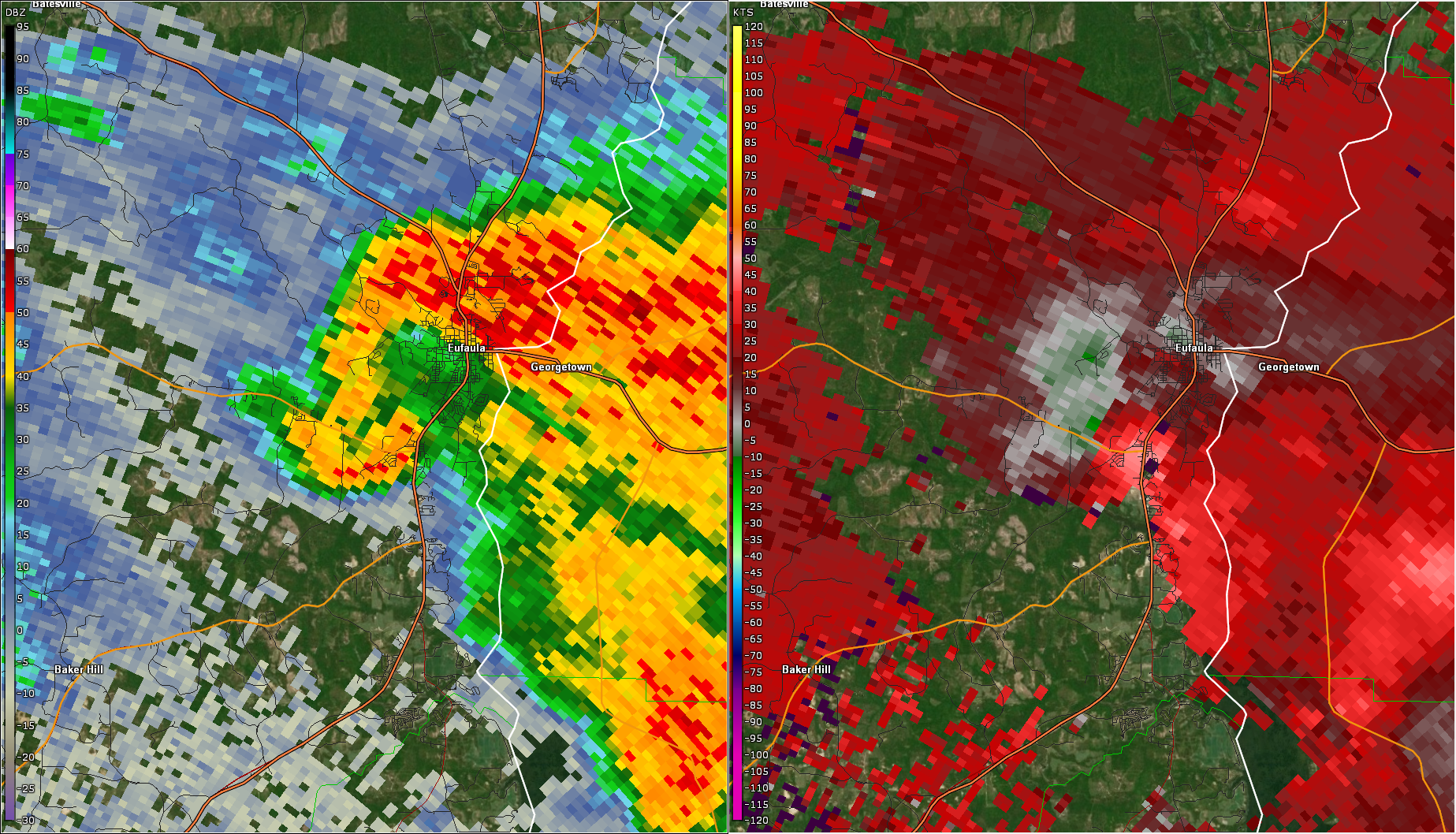 The tornado began somewhere in a forested area between Sandy Lane W west of Highway 30 west of Barbour Creek in Eufaula. It intensified quickly and snapped or uprooted a number of large pine trees on the south side of Hwy 30. The storm crossed HWY 30 and uprooted another grove of pine trees causing damage to a church. The tornado weakened slightly as it crossed US Highway 431, then rapidly intensified and caused the most significant tree damage along the path on the western banks of Barbour Creek, with snapped and uprooted trees and trees causing major damage to a home. As the tornado crossed Barbour Creek, a passing motorist caught the wispy and ragged tornado on video. The tornado continued to the east-northeast and crossed Paul Lee Parkway and State Docks Road, where trees were uprooted, the side of a metal building structure was removed, and 3 units of an apartment complex sustained partial roof damage. The tornado then caused another area of significant tree snaps and uproots between Cypress Cove Drive and Inlet Rd. The tornado weakened somewhat before moving off the banks and over the waters of the Walter F George Reservoir.