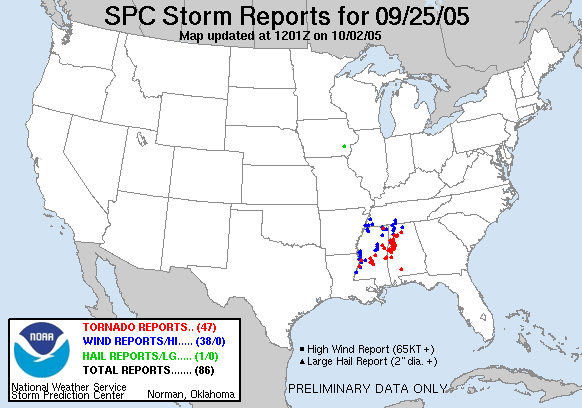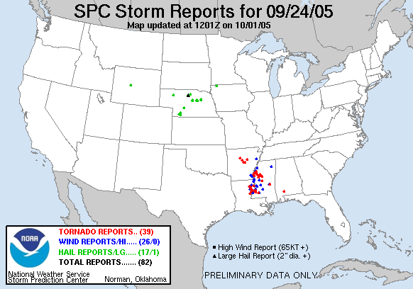 The remnants of Hurricane Rita, winds above the surface, saturated low level conditions and instability all combined to produce several tornadoes in an narrow band across West and Northwest Alabama. 21 tornadoes were confirmed from the mid afternoon hours through the mid evening hours on Sunday, September 25th. Only two injuries were reported with the tornado activity. These injuries occurred in the Buhl community of Western Tuscaloosa county. Many of these tornadoes have been captured on film or video.