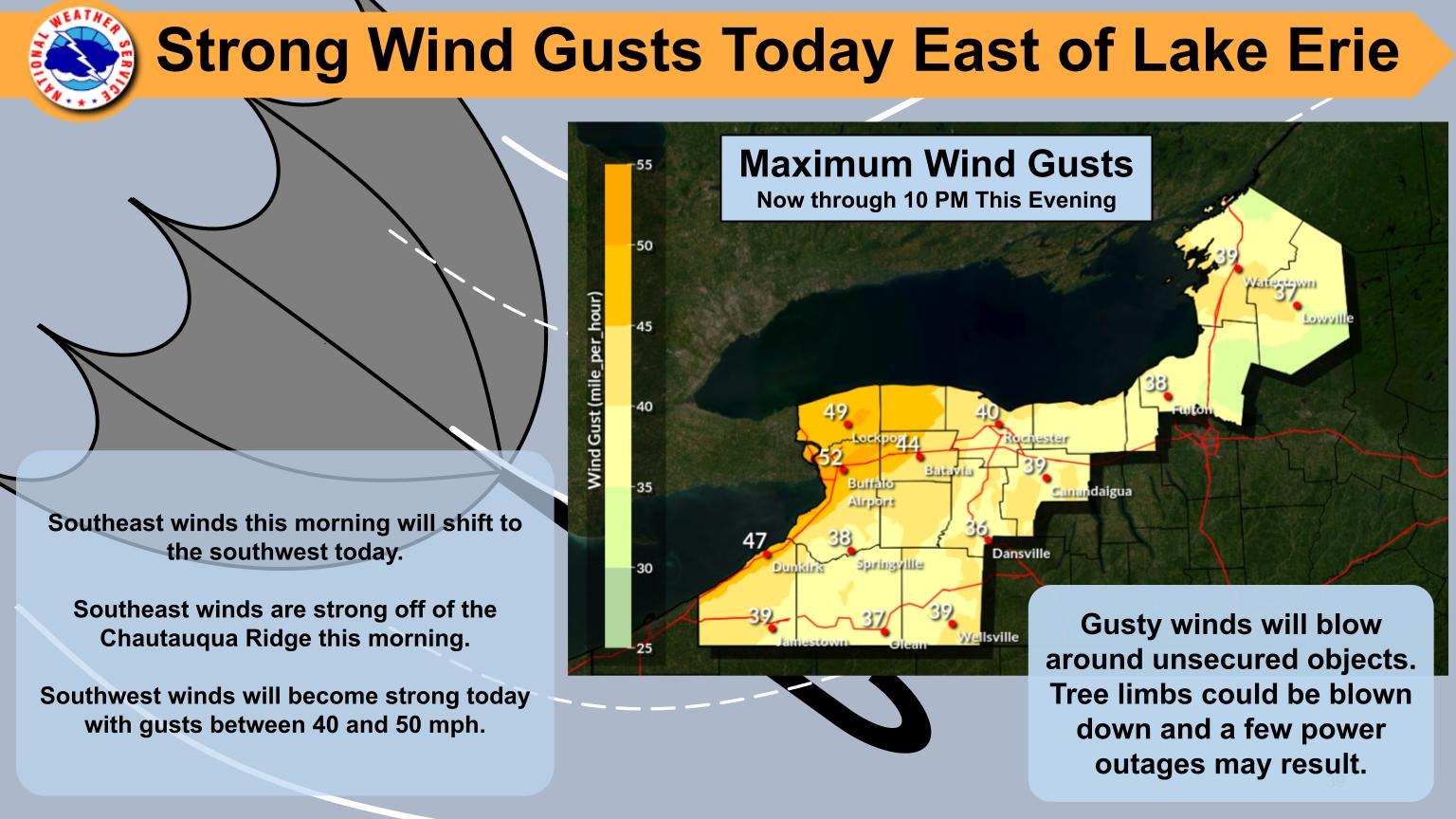 Southeast winds will increase in speed, downsloping off the Chautauqua Ridge this morning to 50 mph. Then during the day today a southwest flow over Lake Erie and inland will reach speeds of 50 mph.