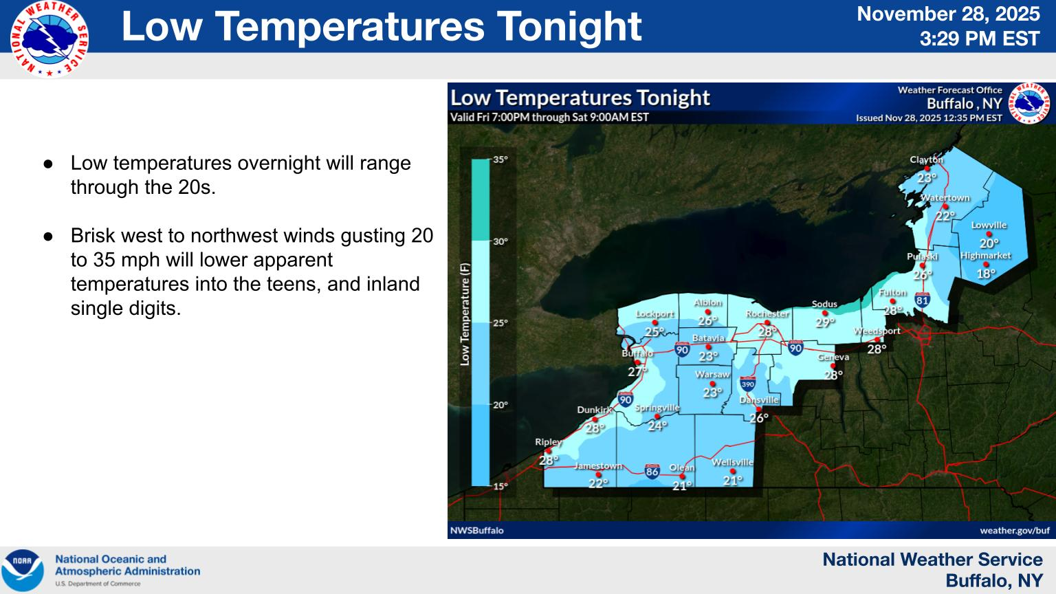 Lake effect snow will continue to accumulate southeast of the eastern Great Lakes through tomorrow morning. A dry snow, that with a brisk west to northwest wind, will lend to blowing and drifting across open areas.