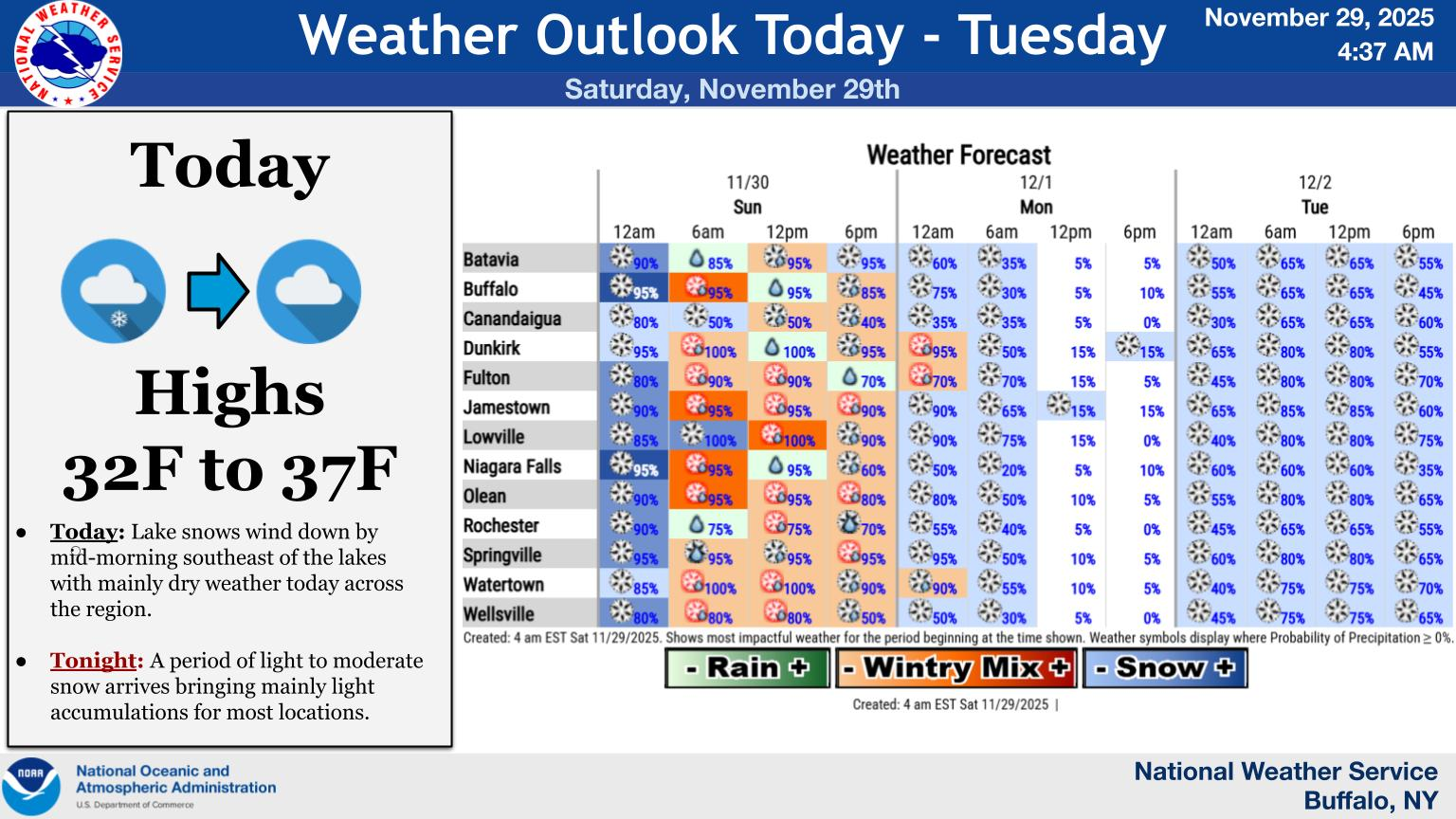 Heavy lake effect snow will persist downwind of the Great Lakes through early Saturday. Snow squalls with heavy snow and gusty winds will create dangerous travel in the Interior Northeast due to low visibility and slippery roads. A major winter storm will bring moderate to heavy, accumulating snow and gusty winds from the eastern Plains to the western Great Lakes today through Saturday. Read More >