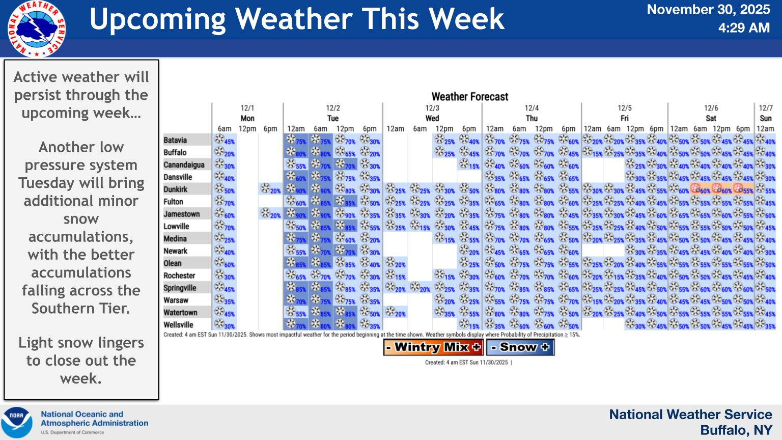 Active weather will persist throughout this upcoming week. Another low pressure system will arrive on Tuesday and bring minor snow accumulations, with the better accumulations falling across the Southern Tier. Light snow will then linger throughout the remainder of the week.
