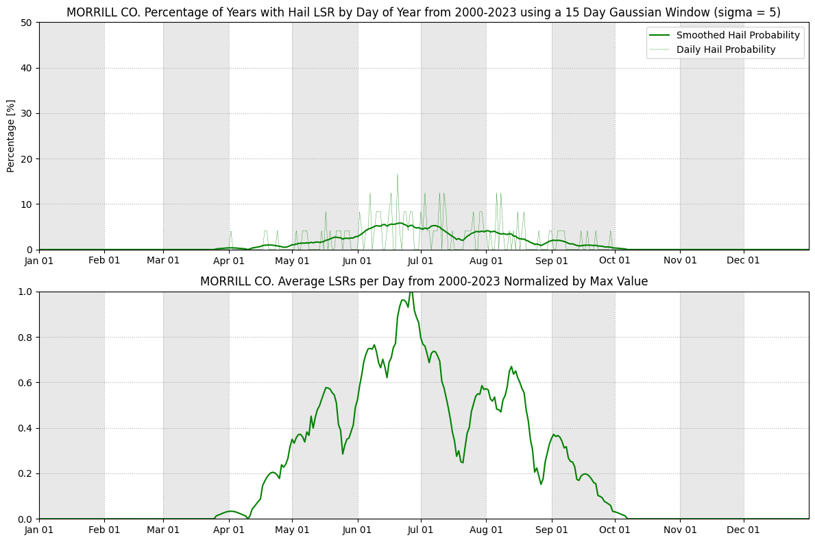 The calendar time series plots below highlight the time of year when hail is most likely to occur across the region. The percentage of years with a hail report was calculated over the period of record from 2000 to 2023 on each day of the calendar year. This data was then smoothed using a 15-day moving window to determine the probability of receiving a hail report for any day in the calendar year (top). Overall, the probability of receiving a hail report on any given day across the NWS Cheyenne CWA is around 35% near the start of July. Daily probabilities exceeding 10% start in the beginning of May and continue until early September. Additionally, the average LSRs per day normalized by maximum value plots (bottom) highlight the peak times for hail throughout the year across the NWS Cheyenne CWA. The peak of hail season occurs in June with a secondary maximum in late July for the NWS Cheyenne CWA. The following plots break down these probabilities by individual counties across southeast Wyoming and western Nebraska. The same caveat with the previous maps applies here as each county has varying population density and road networks that could lead to under-reporting occurrences of hail. |