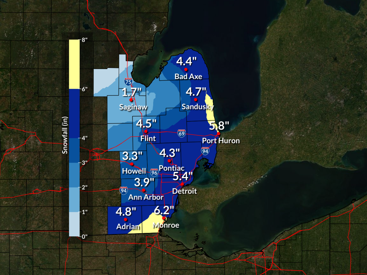 The Eastern Thumb: Northeast winds off Lake Huron added localized moisture, resulting in isolated totals of 7+ inches along the lakeshore.