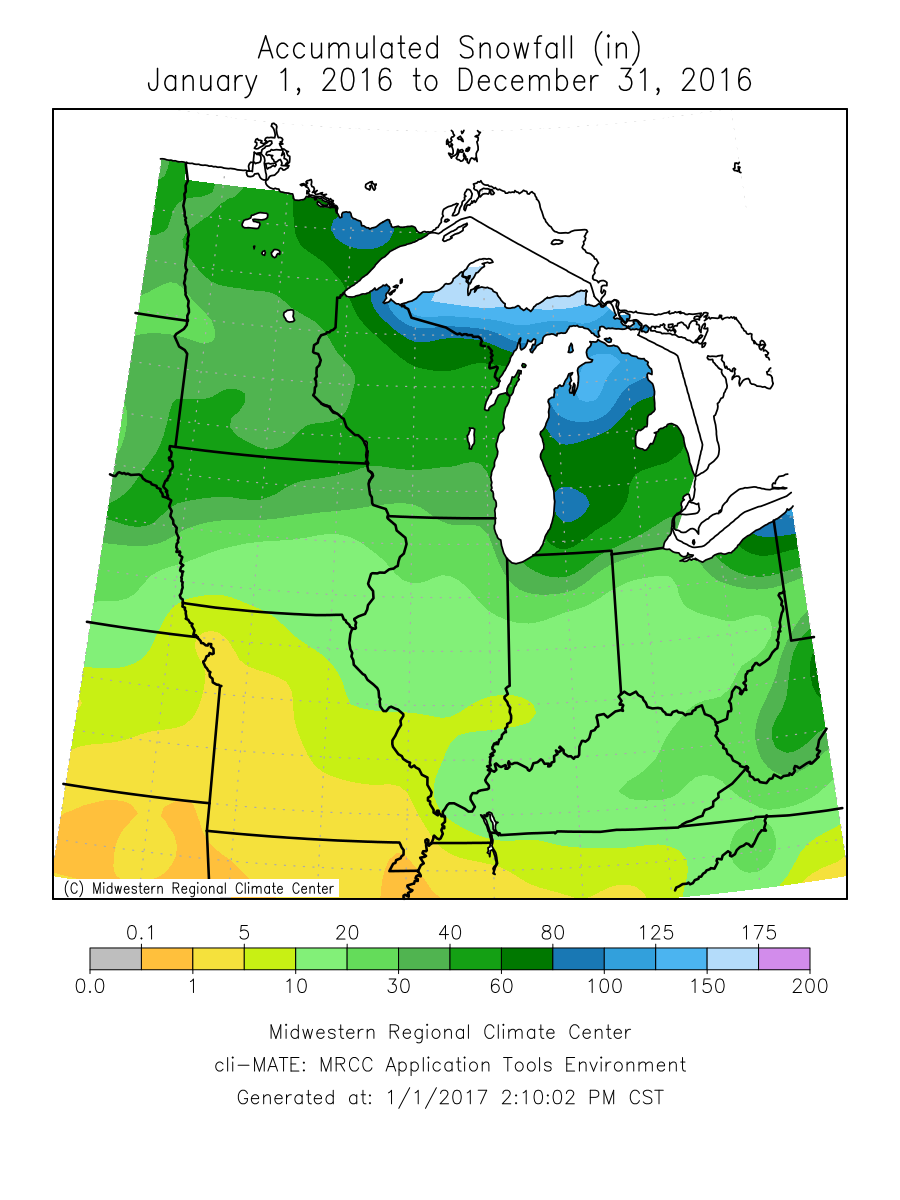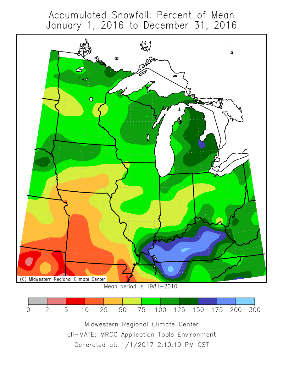 | Snowfall totals for 2016 were -7.1 inches below normal at Moline to -9.9 inches below normal at Dubuque. |