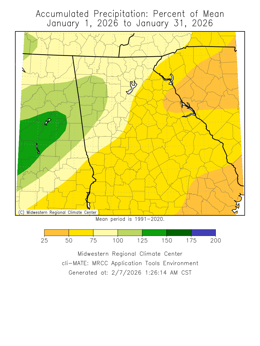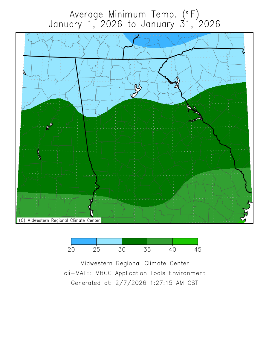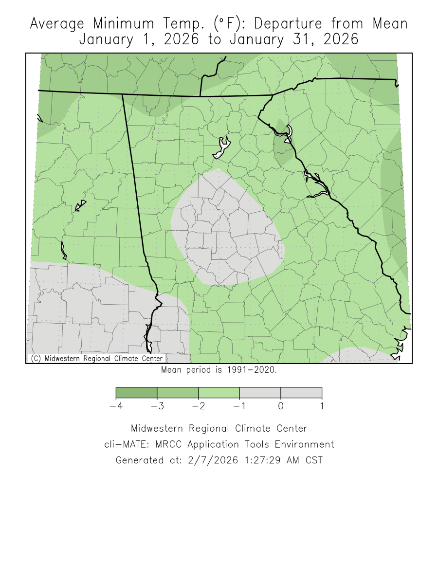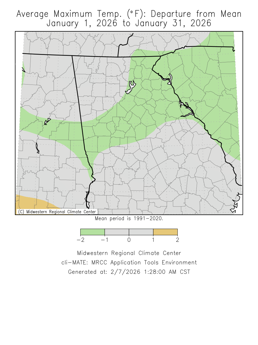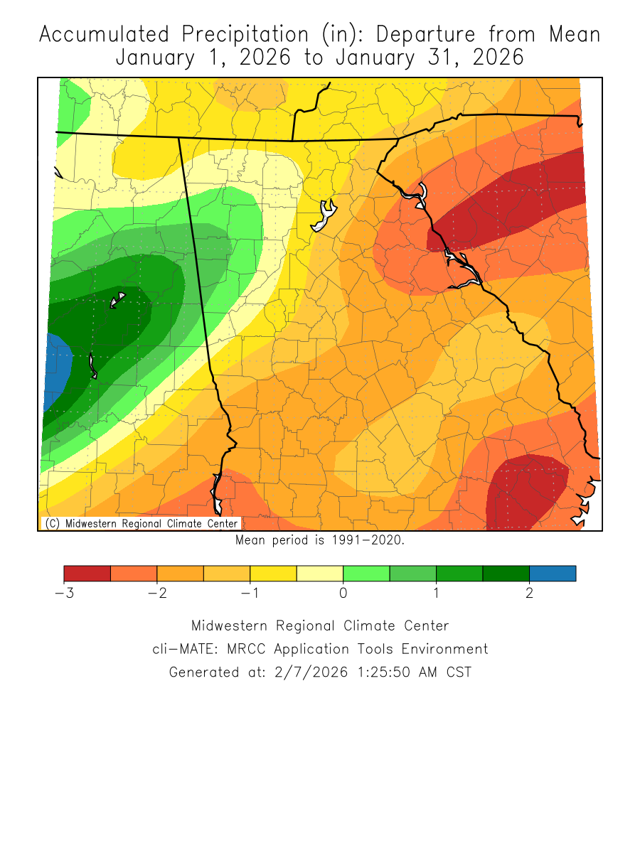 Temperatures through the month of January was around normal. Precipitation through the month of January was an inch and a half below normal.