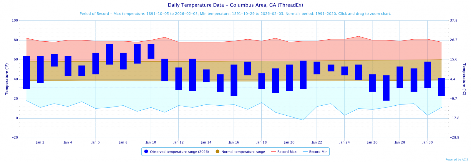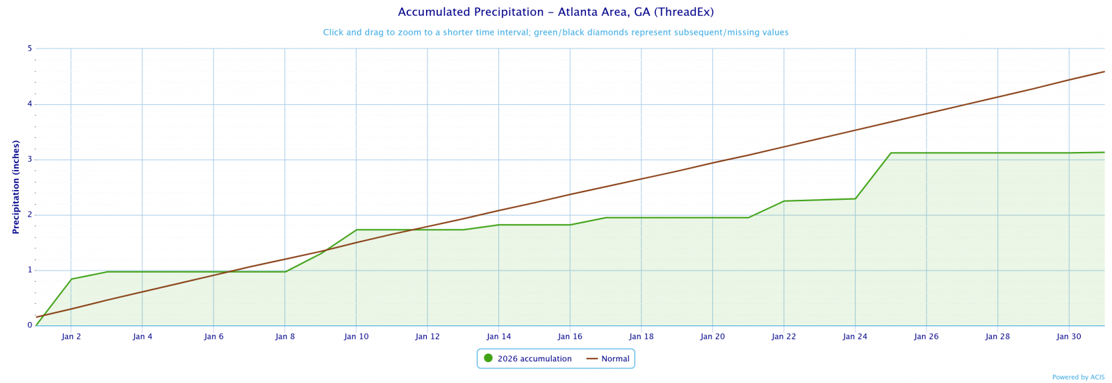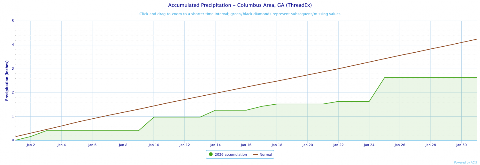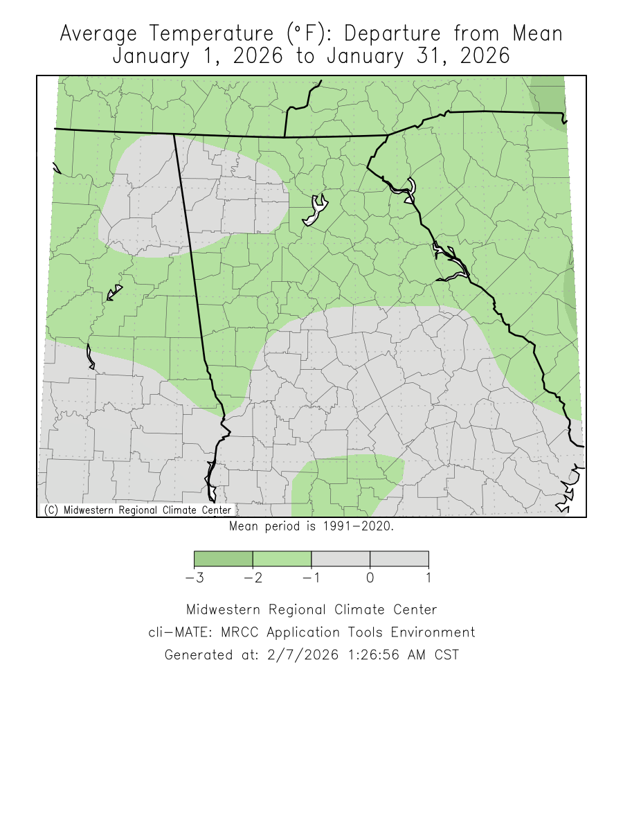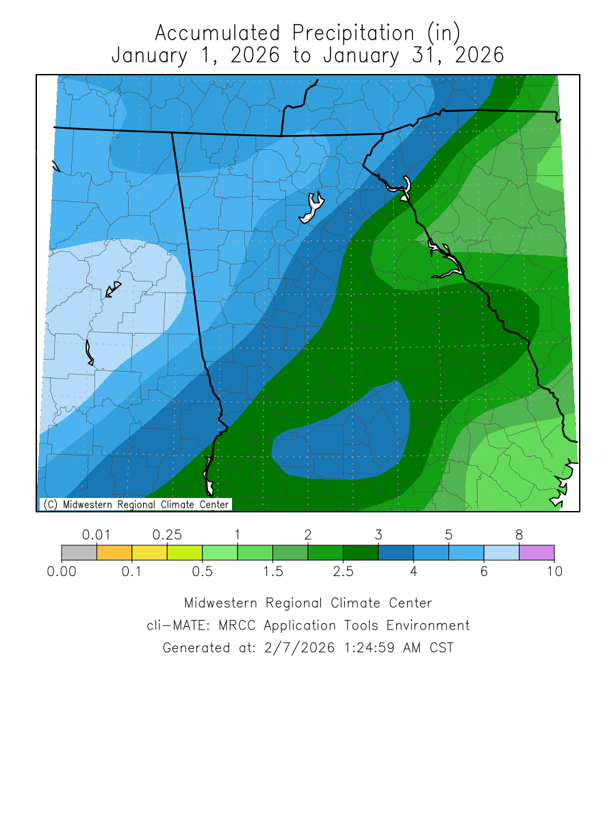 Temperatures through the month of January was around normal. Precipitation through the month of January was an inch and a half below normal.
