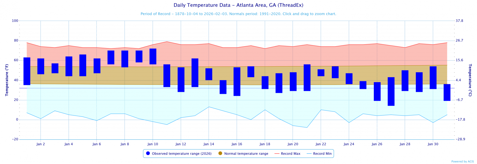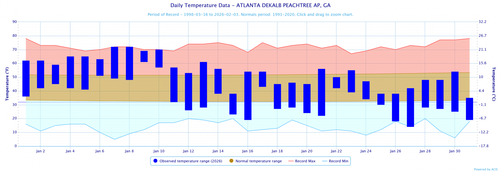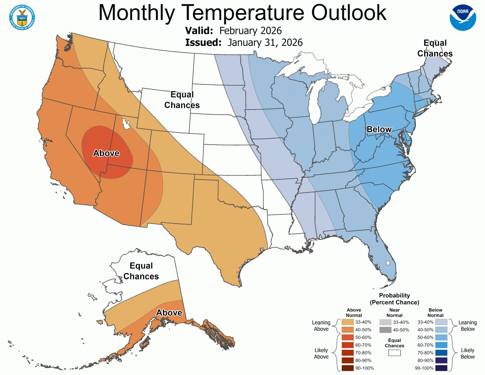 Based on the Climate Prediction Center's outlook for February, north and central Georgia has a 40%-50% chance of below normal temperatures. North and central Georgia has a 33-40% below normal precipitation.