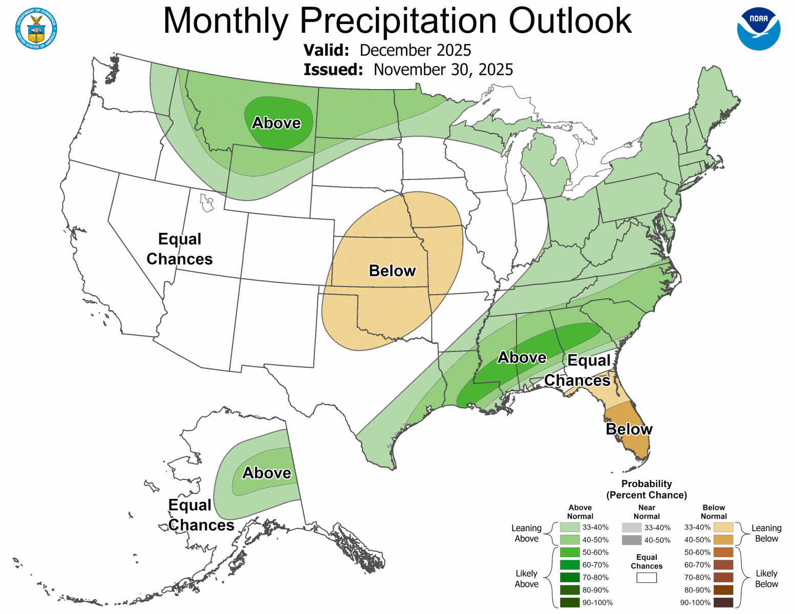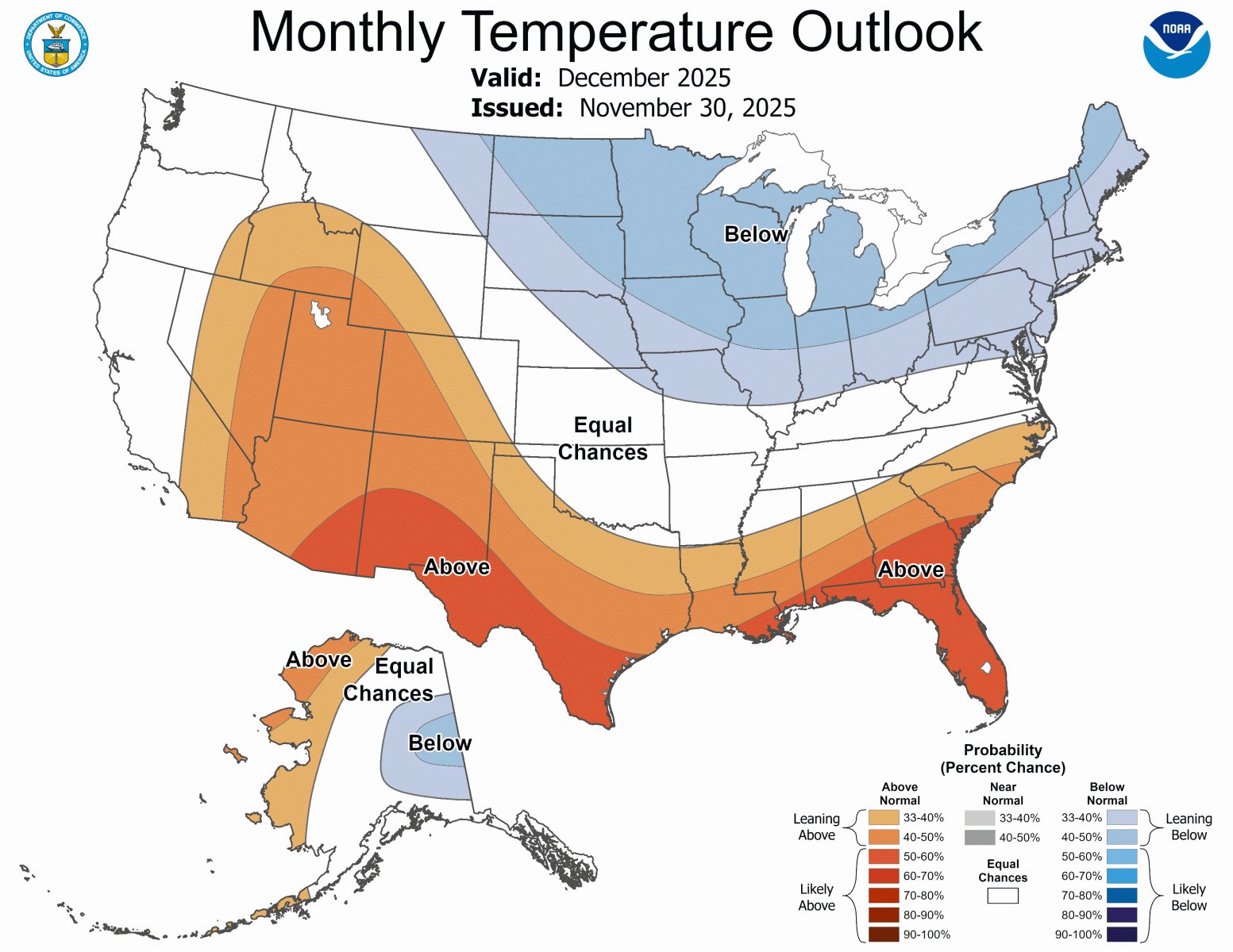 Based on the Climate Prediction Center's outlook for December, Georgia has a 30-50% chance for above normal temperatures. For precipitation, most of Georgia has of south and central Georgia has a 40-60% chance of below normal precipitation while the remainder of Georgia has an equal chance of above or below normal precipitation.