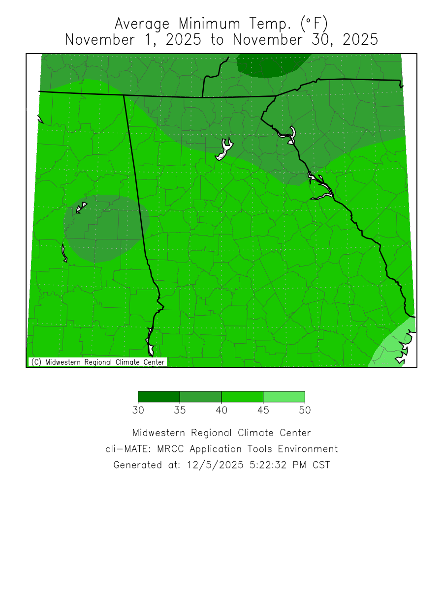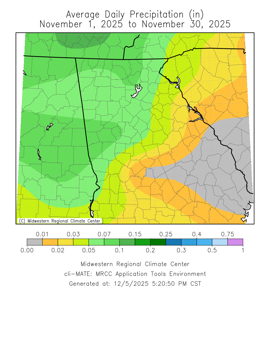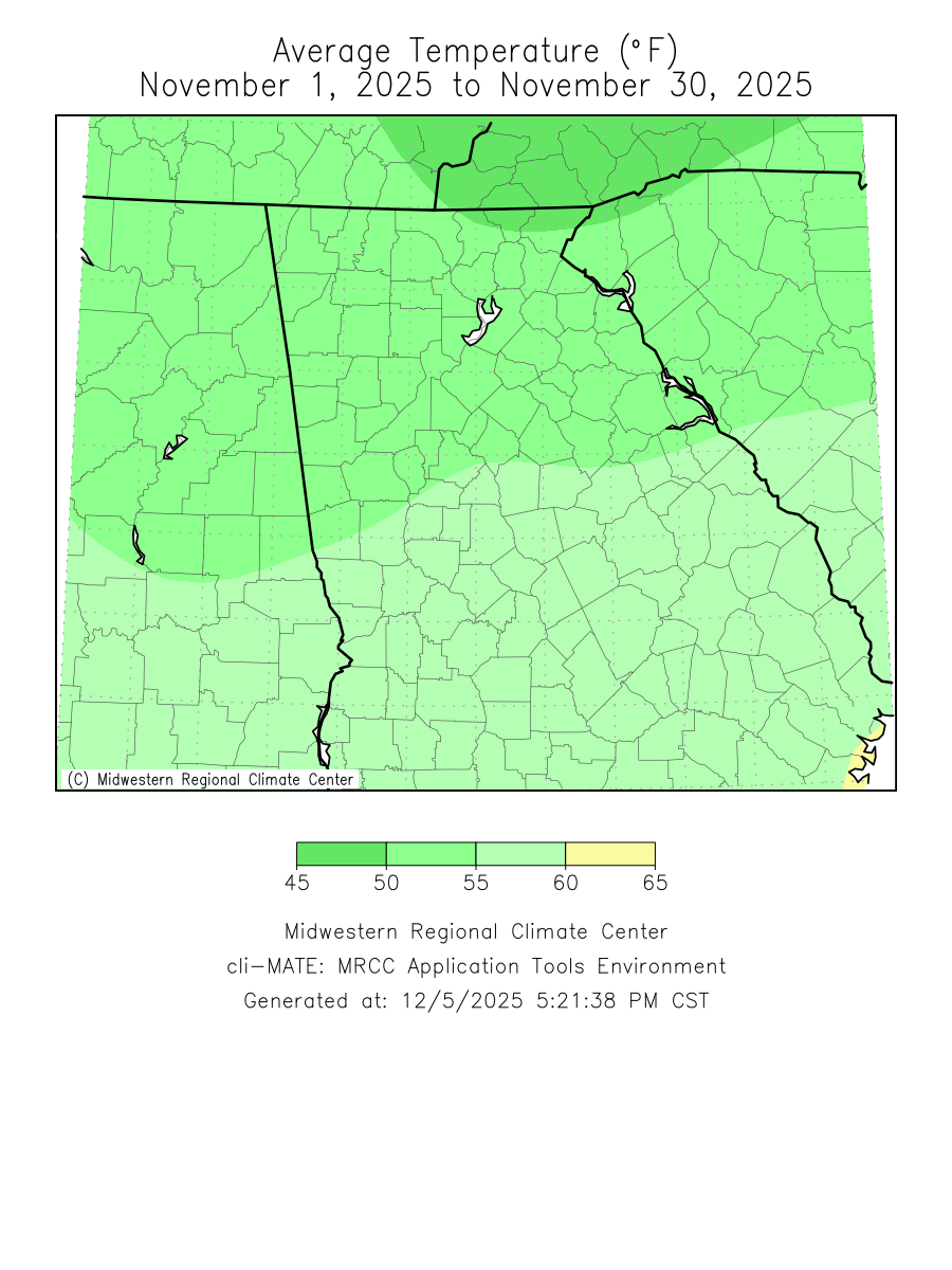 Temperatures through the month of November were around three degrees above normal. Precipitation through the month of November was between two to three inches below normal.