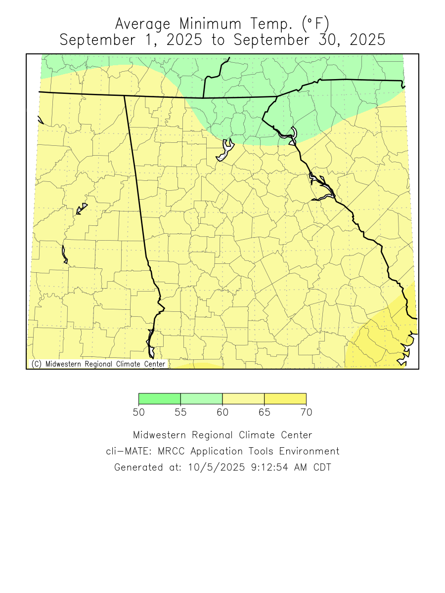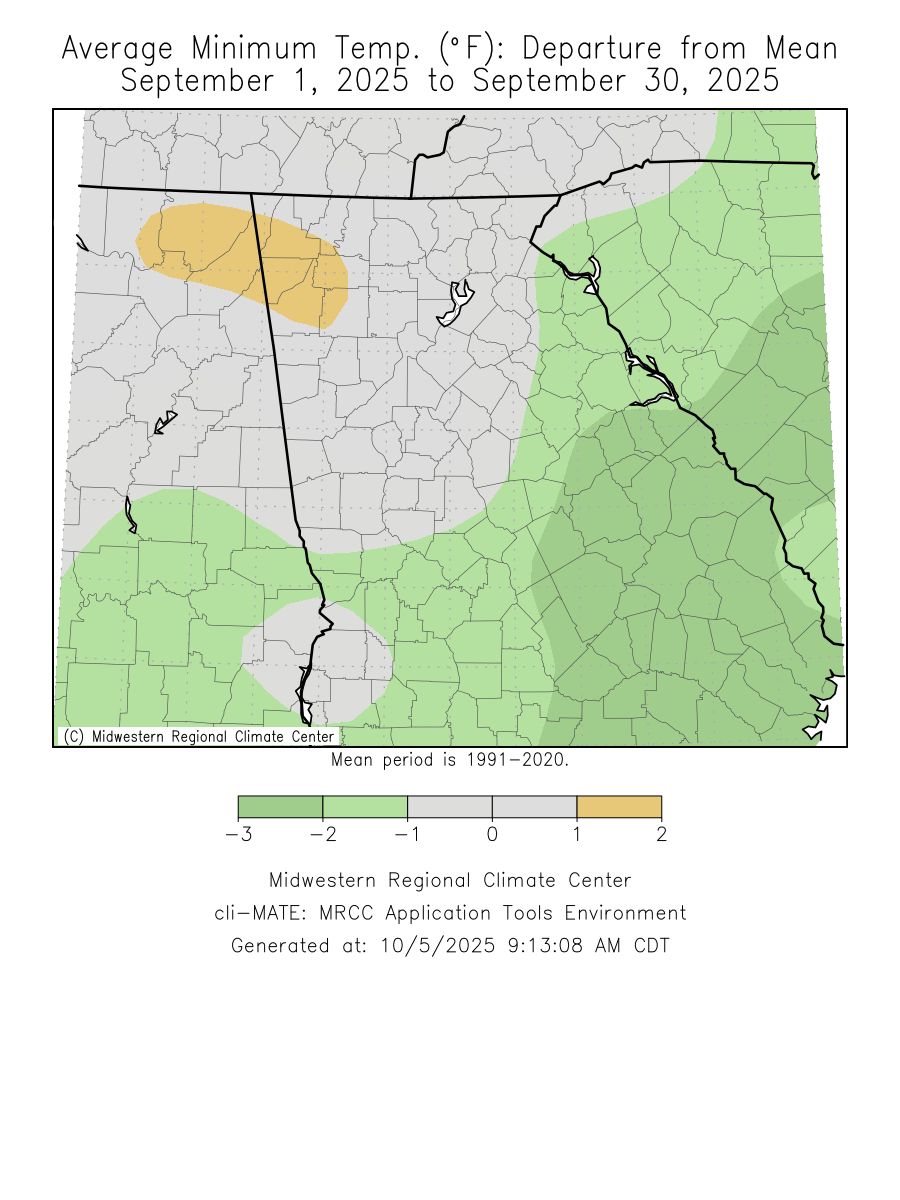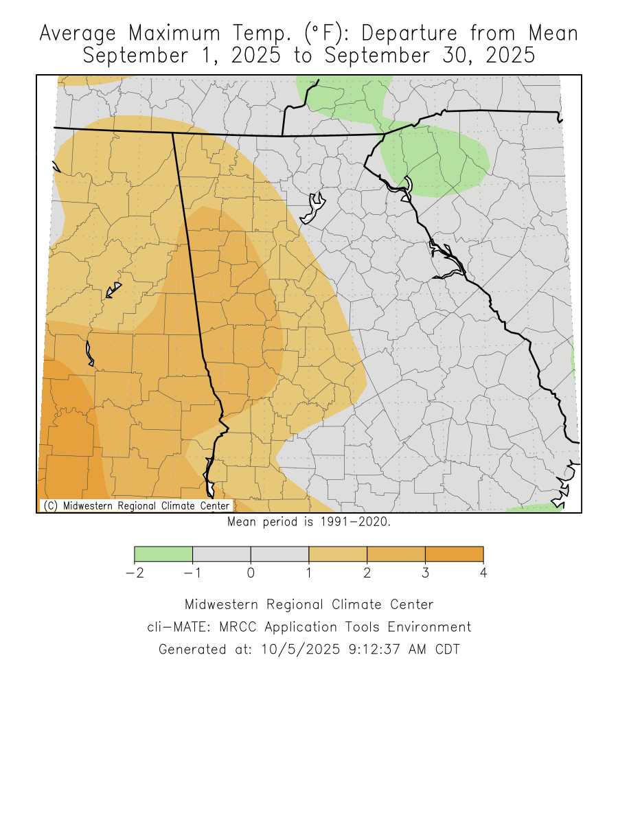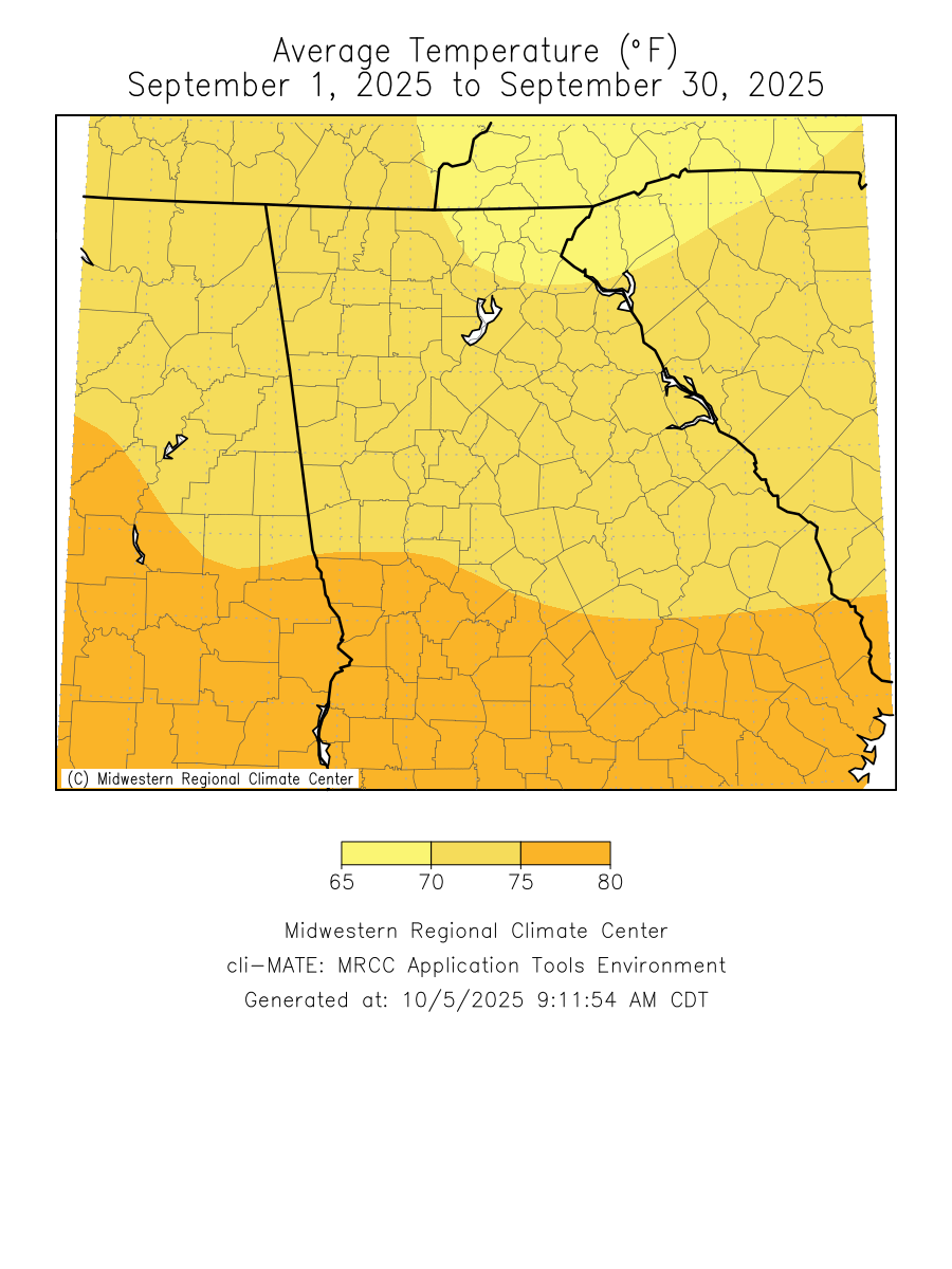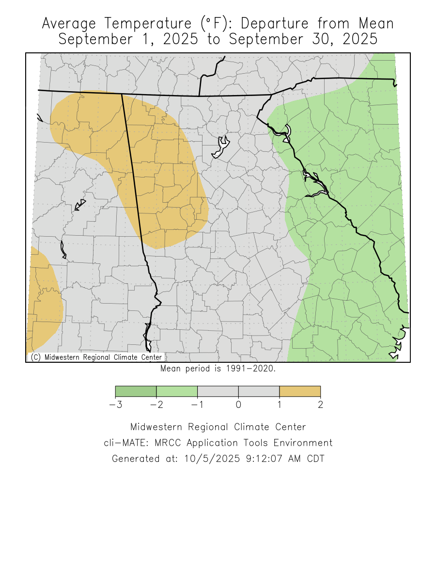 Temperatures through the month of September were within one degree of normal. Precipitation through the month of September was around two degrees below normal.