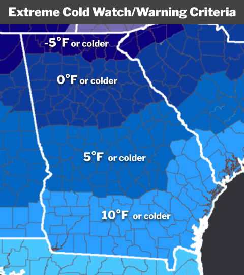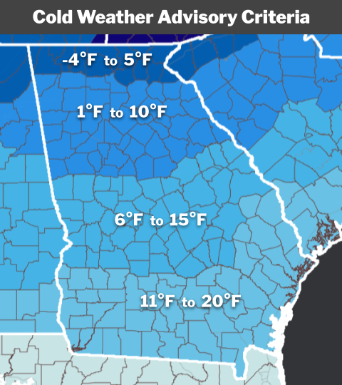 The National Weather Service Atlanta office issues the following official cold temperature related products based on the apparent temperature (or wind chill) forecast and specific county criteria that can be found here or on the maps below.