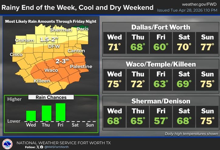Widespread rain showers are expected to develop tonight and bring multiple rounds of rain to North and Central Texas through Friday night. Rain may be heavy at times, bringing a low flooding threat to portions of Central Texas. The greatest flooding threat looks to generally be south of US-84 on Friday. Isolated thunderstorms will be possible as well, especially across Central Texas. While severe weather appears unlikely at this time, a few storms may be on the stronger side bringing the potential for frequent lightning, small hail, and/or gusty winds.