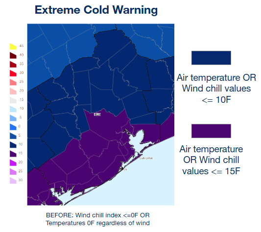 This product now includes both wind chill values and/or temperature. The criteria for this product changes across the region. It is issued when areas in the dark purple may see <= 15°F and areas in the dark blue may see <= 10°F. |