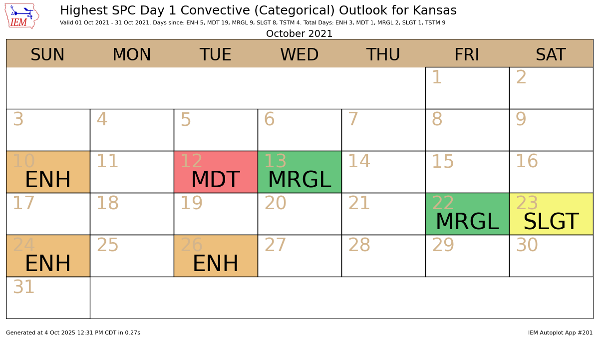 Forecasted October 2021 severe thunderstorm days across Kansas by the Storm Prediction Center (SPC), and the associated severe risk. SPC highlighted portions of Kansas 7 days during the month. |