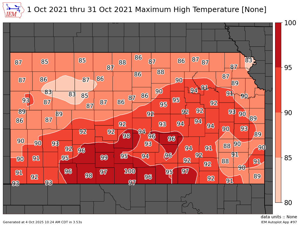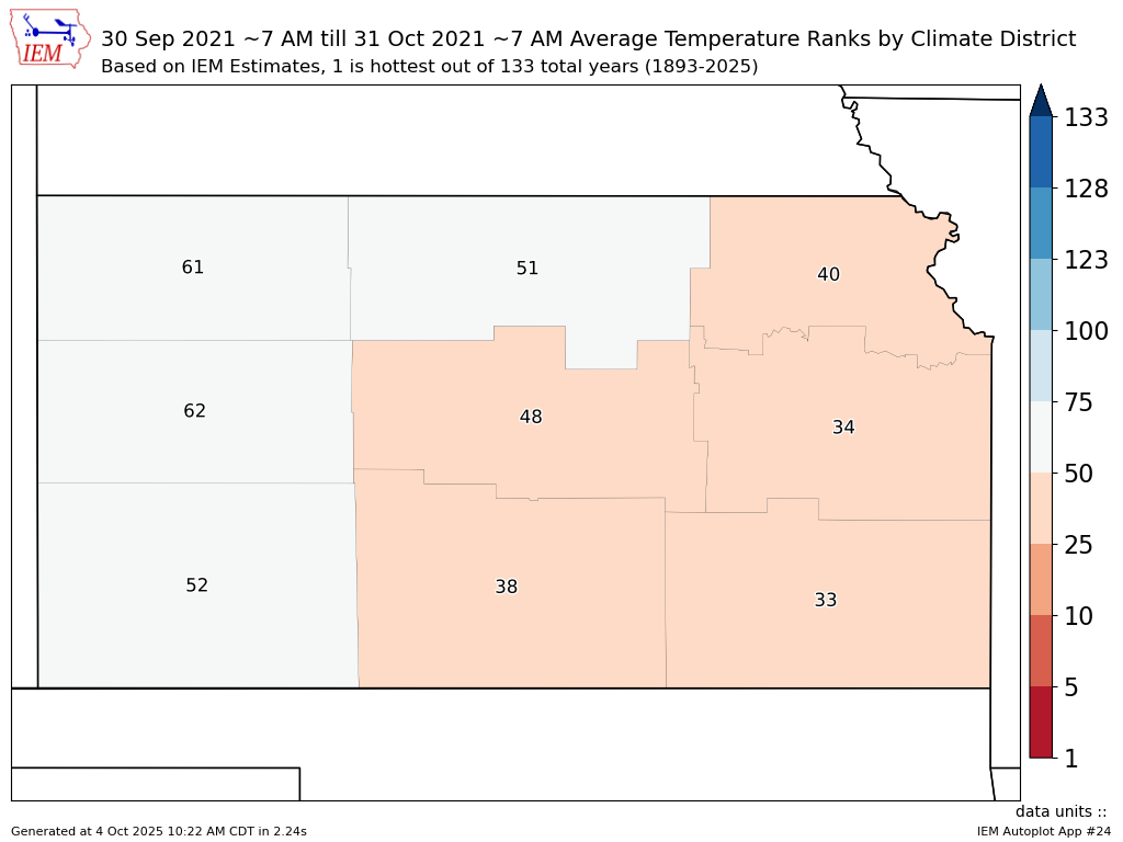 Kansas October 2021 temperature rankings by division. The number 1 denotes the warmest October on record (since 1893), 129 denotes the coolest. With the exception of the northwest, all divisions averaged warmer than normal in October. |