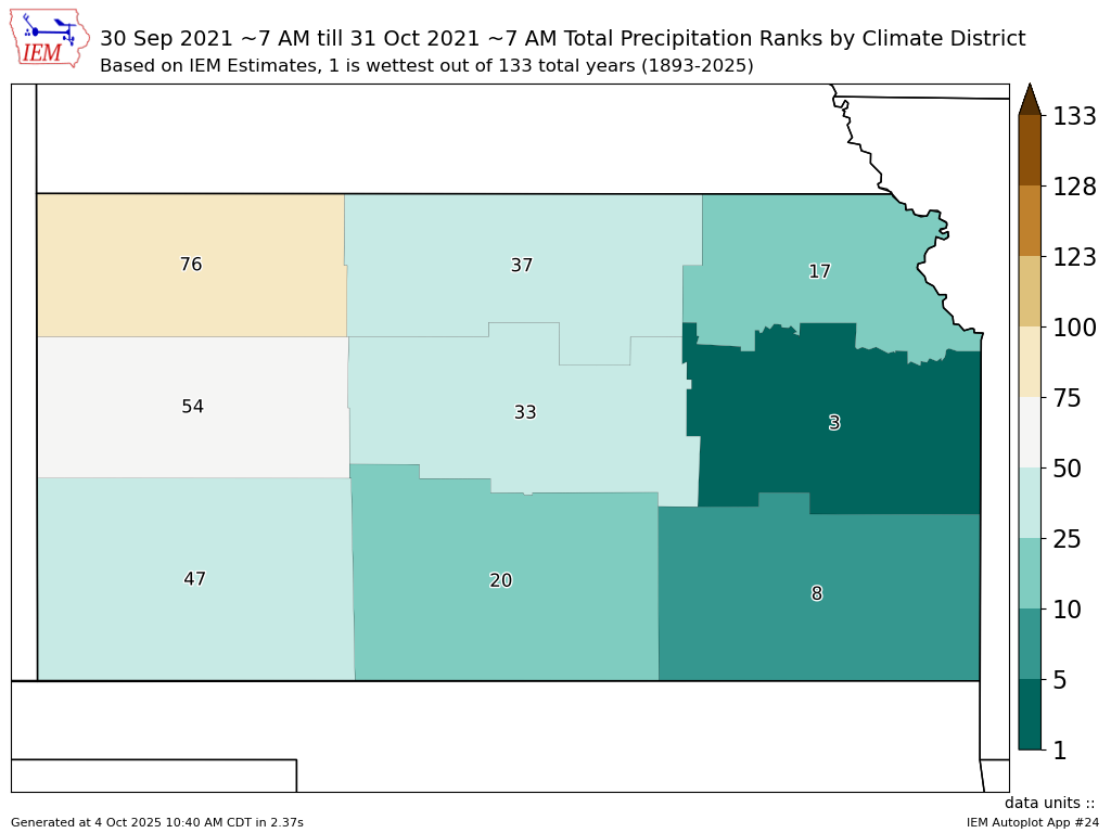 Kansas October 2021 precipitation rankings by division. The number 1 denotes the wettest October on record (since 1893), 129 denotes the driest. All divisions averaged near to above normal rainfall, with the east-central division recording its 8th wettest October on record. |