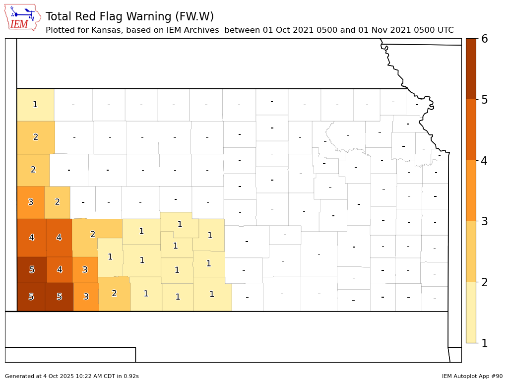 The number of county-based red flag warnings issued in October across Kansas for extreme fire danger. Twenty-six counties were impacted by red flag warnings. | The number of red flag warnings issued across Kansas each month since 2006. October 2021 tallied 8 red flag warnings across the state, which was just a above the October average of 6 to 7. |