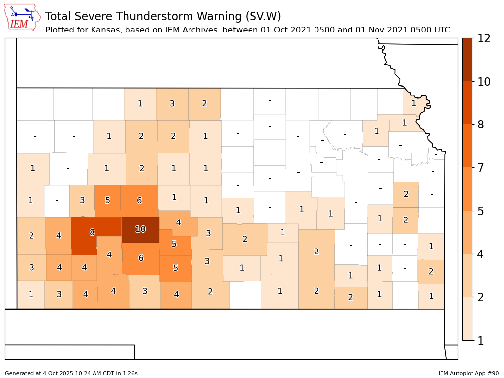The number of county-based severe thunderstorm warnings issued in October across Kansas. Sixty-two counties were impacted by severe thunderstorm warnings. | The number of severe thunderstorm warnings issued across Kansas each month since 1986. October 2021 tallied 47 severe thunderstorm warnings, well above the October average of about 22 to 24. It was the 7th highest number of October severe thunderstorm warnings since 1986. |