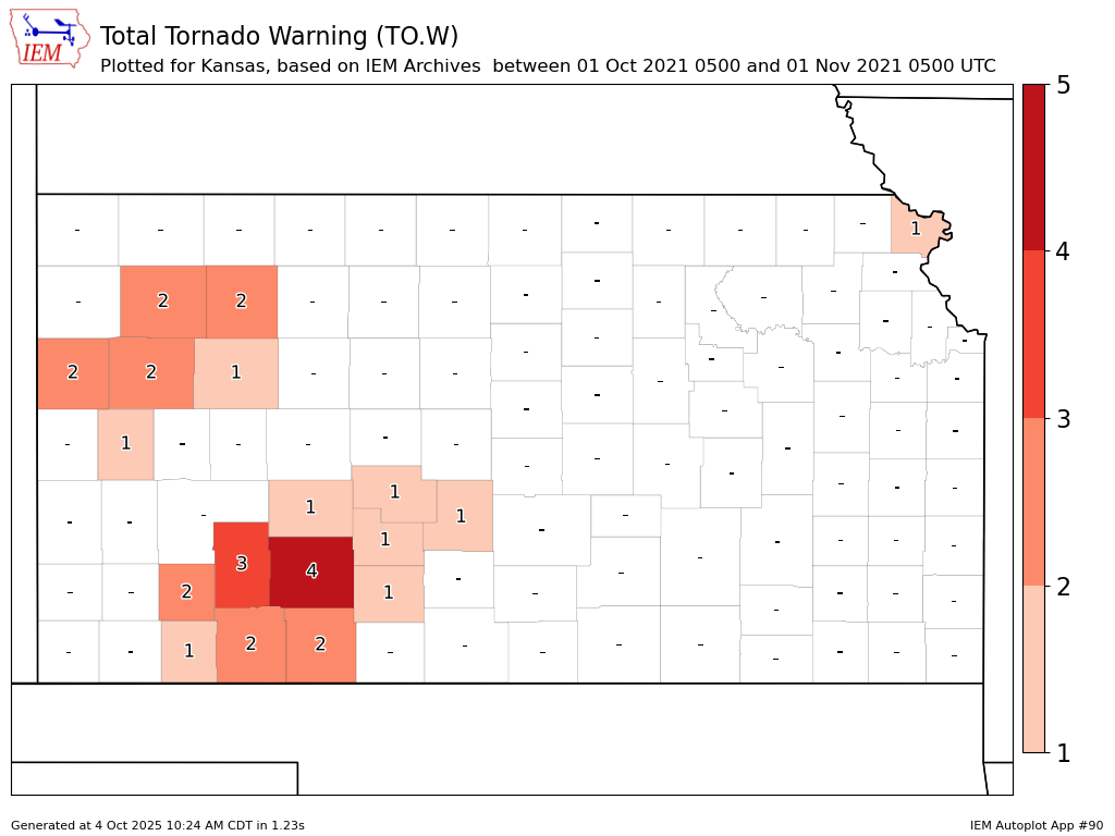 The number of county-based tornado warnings issued October 2021 across Kansas. Eighteen counties were impacted by tornado warnings. | The number of tornado warnings issued across Kansas each month since 1986. October 2021 tallied 13 tornado warnings, well above the October average of about 3 to 4. It tied for the 4th most October tornado warnings since 1986. |