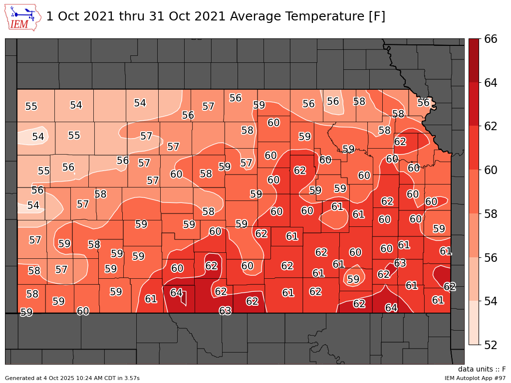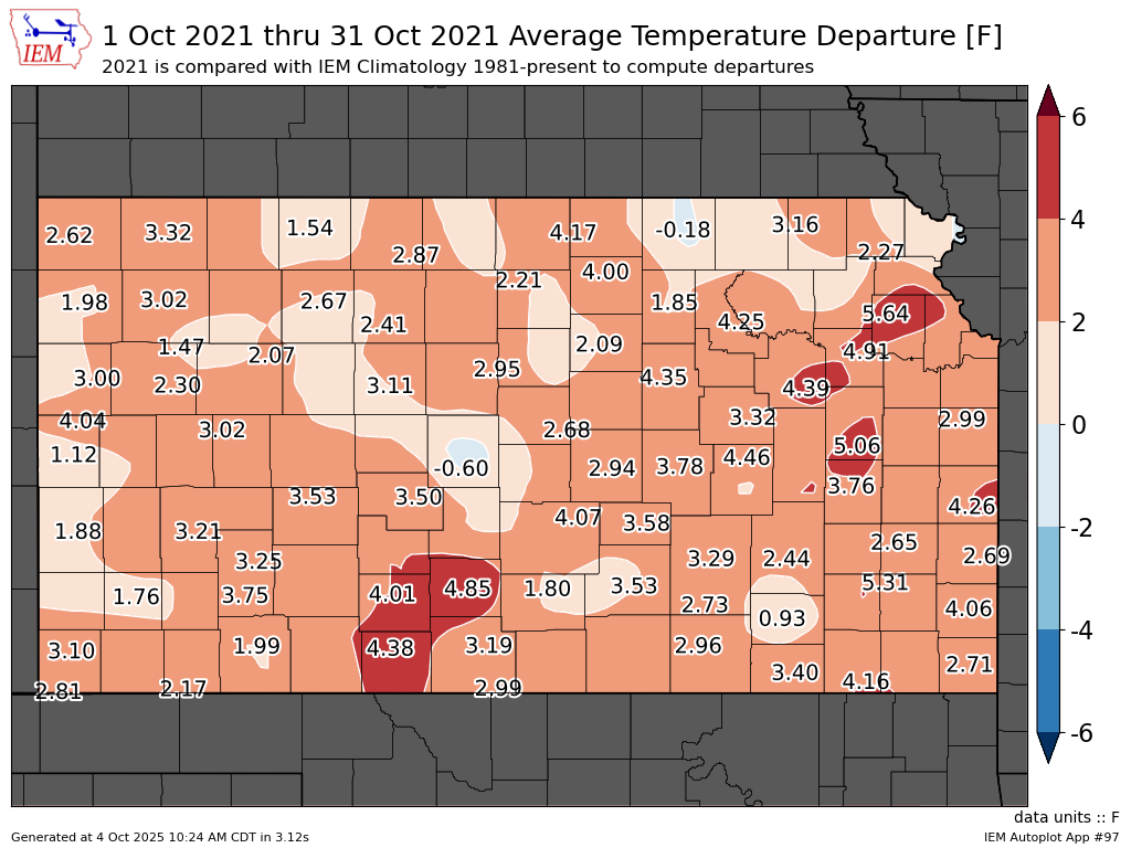 Kansas October 2021 average temperatures (the average of each daily high and low temperature). | Kansas October 2021 average temperature departures from normal. Essentially the entire state averaged warmer than normal for the month. |