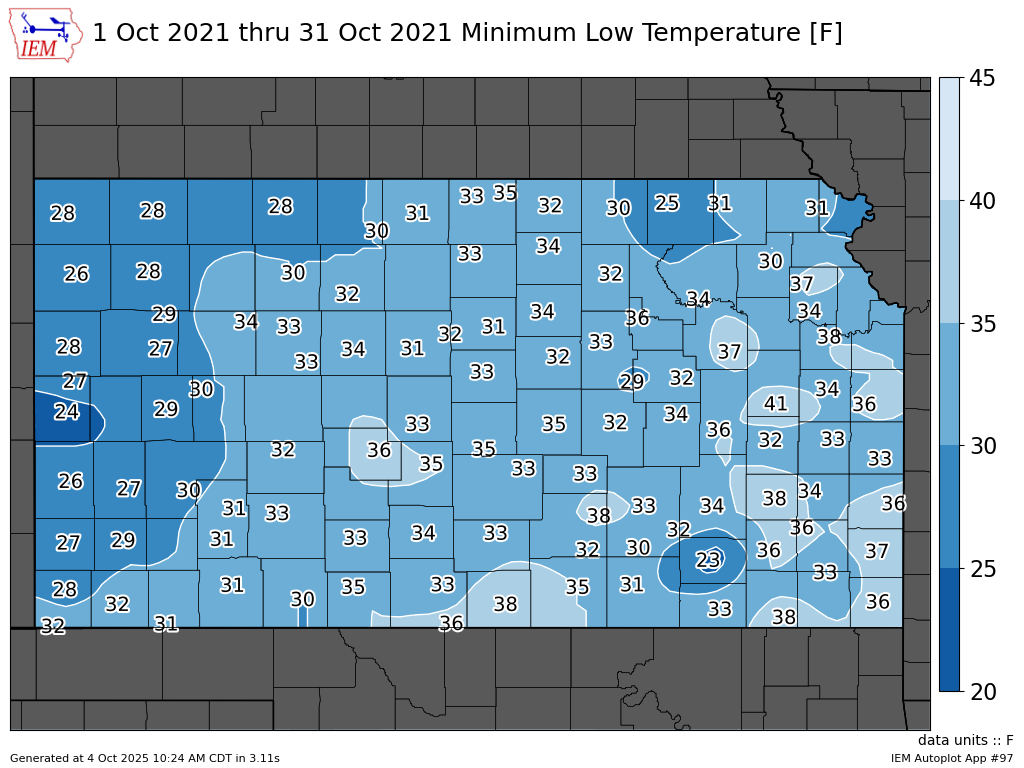 The warmest temperatures recorded during October 2021 across Kansas were in the 80s and 90s, warmest across central and southern portions. | The coolest temperatures recorded during October 2021 across Kansas were in the 20s and 30s, coolest across western portions. |