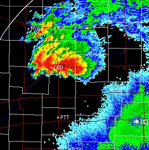 Radar imagery showed a pair of storm relative velocity couplets (inbound winds right next to outbound winds) as they moved northeast across the county. Fortunately, the tornado that was bearing down on Main St. in Claflin lifted just outside of town. The damage to the grain bins and trees across the small community were due straight line winds produced from the rear flank downdraft.