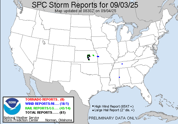 Preliminary Local Storm Report...Summary National Weather Service Wichita KS 1007 PM CDT Wed Sep 3 2025 ..TIME... ...EVENT... ...CITY LOCATION... ...LAT.LON... ..DATE... ....MAG.... ..COUNTY LOCATION..ST.. ...SOURCE.... ..REMARKS.. 0508 PM Hail 4 W Salina 38.82N 97.69W 09/03/2025 M1.00 Inch Saline KS Trained Spotter 0516 PM Hail 5 NW Smolan 38.80N 97.74W 09/03/2025 M2.75 Inch Saline KS Emergency Mngr 0516 PM Hail 4 W Salina 38.83N 97.70W 09/03/2025 E1.50 Inch Saline KS Public 0520 PM Hail 1 NW Salina 38.82N 97.63W 09/03/2025 M1.25 Inch Saline KS Public 0525 PM Hail 3 E Smolan 38.74N 97.62W 09/03/2025 M2.25 Inch Saline KS Broadcast Media Delayed report, time estimated via radar. 0526 PM Hail 3 NE Smolan 38.77N 97.65W 09/03/2025 M1.50 Inch Saline KS Trained Spotter Hail was covering the ground south of Salina Airport. 0533 PM Hail Assaria 38.68N 97.61W 09/03/2025 M1.50 Inch Saline KS Emergency Mngr 0536 PM Hail Assaria 38.68N 97.61W 09/03/2025 E1.50 Inch Saline KS Trained Spotter 0540 PM Hail Marquette 38.56N 97.84W 09/03/2025 E1.50 Inch McPherson KS Public Size estimated from picture sent with quarter for scale. 0545 PM Hail 2 SSW Assaria 38.66N 97.62W 09/03/2025 E1.75 Inch Saline KS Storm Chaser 0602 PM Hail 6 WNW Lost Springs 38.60N 97.06W 09/03/2025 M2.00 Inch Marion KS Emergency Mngr Two inch size hail in Ramona. 0609 PM Hail 6 WNW Lost Springs 38.60N 97.06W 09/03/2025 E3.00 Inch Marion KS Emergency Mngr Report from Ramona. 0610 PM Hail 1 N Mcpherson 38.39N 97.66W 09/03/2025 M1.50 Inch McPherson KS Trained Spotter 0614 PM Hail 1 N Mcpherson 38.39N 97.66W 09/03/2025 E1.75 Inch McPherson KS Trained Spotter 0616 PM Hail 1 N Mcpherson 38.39N 97.66W 09/03/2025 M2.00 Inch McPherson KS Trained Spotter 0621 PM Hail Mcpherson 38.37N 97.66W 09/03/2025 E2.75 Inch McPherson KS Broadcast Media 0638 PM Tstm Wnd Gst 6 ESE Inman 38.20N 97.66W 09/03/2025 M71 MPH McPherson KS Public Measured from personal weather station. 0642 PM Hail 1 N Moundridge 38.22N 97.52W 09/03/2025 M1.75 Inch McPherson KS Trained Spotter 0644 PM Hail 7 SW Moundridge 38.15N 97.62W 09/03/2025 E2.75 Inch Harvey KS Public Relayed via phone. 0651 PM Tstm Wnd Gst 6 S Moundridge 38.11N 97.52W 09/03/2025 E60 MPH Harvey KS Trained Spotter Reported half dollar size hail as well. 0658 PM Hail 5 NW Halstead 38.05N 97.57W 09/03/2025 M2.25 Inch Harvey KS Trained Spotter Golf ball to tennis ball size hail. 0702 PM Hail 7 WSW Mcpherson 38.33N 97.78W 09/03/2025 M1.50 Inch McPherson KS Trained Spotter 0704 PM Tstm Wnd Dmg 1 NW Halstead 38.01N 97.52W 09/03/2025 Harvey KS Law Enforcement Railroad crossing arms were ripped off from thunderstorm winds estimated around 75mph in Halstead. 0706 PM Tstm Wnd Gst Halstead 38.00N 97.51W 09/03/2025 E60 MPH Harvey KS Law Enforcement Reported with tennis ball size hail. 0706 PM Hail Halstead 38.00N 97.51W 09/03/2025 M2.50 Inch Harvey KS Law Enforcement Reported with 60 mph winds. 0710 PM Hail 3 NE Inman 38.26N 97.73W 09/03/2025 M1.75 Inch McPherson KS Trained Spotter 0716 PM Hail Sedgwick 37.92N 97.43W 09/03/2025 M1.75 Inch Harvey KS Emergency Mngr 0731 PM Hail Valley Center 37.84N 97.37W 09/03/2025 M1.75 Inch Sedgwick KS Broadcast Media 0739 PM Hail Park City 37.80N 97.32W 09/03/2025 E1.50 Inch Sedgwick KS Law Enforcement Relayed via emergency manager. 0740 PM Hail 2 SSE Wichita 37.72N 97.32W 09/03/2025 E2.75 Inch Sedgwick KS Public 0742 PM Tstm Wnd Gst 3 SE Maize 37.74N 97.43W 09/03/2025 E75 MPH Sedgwick KS NWS Employee Reported 70-75 mph estimated, with a small bit of paneling blown off roof of gas station. 0742 PM Hail Park City 37.80N 97.32W 09/03/2025 M1.75 Inch Sedgwick KS Broadcast Media KSN news media reported golf ball size hail in Park City. 0743 PM Tstm Wnd Dmg 3 SE Maize 37.74N 97.43W 09/03/2025 Sedgwick KS NWS Employee Reported a portion of paneling blown off roof of gas station. 0750 PM Hail Halstead 38.00N 97.51W 09/03/2025 M1.75 Inch Harvey KS Emergency Mngr Golfball size hail covering most of the ground. 0800 PM Tstm Wnd Gst Mcconnell Air Force Bas 37.62N 97.27W 09/03/2025 M71 MPH Sedgwick KS ASOS 0815 PM Hail 3 NW Downtown Wichita 37.72N 97.39W 09/03/2025 E2.50 Inch Sedgwick KS Broadcast Media 0817 PM Tstm Wnd Gst 2 SE Maize 37.75N 97.44W 09/03/2025 E60 MPH Sedgwick KS Broadcast Media 0817 PM Hail 2 SE Maize 37.75N 97.44W 09/03/2025 M1.25 Inch Sedgwick KS Broadcast Media 0822 PM Tstm Wnd Gst Wichita Eisenhower Airp 37.65N 97.44W 09/03/2025 M58 MPH Sedgwick KS ASOS 0822 PM Hail 3 WNW Downtown Wichita 37.70N 97.39W 09/03/2025 E2.00 Inch Sedgwick KS NWS Employee Many ping pong ball size hailstones along with a couple of 2 inch hailstones. 0824 PM Hail 3 SSW Downtown Wichita 37.65N 97.35W 09/03/2025 M1.75 Inch Sedgwick KS Trained Spotter 0829 PM Flood 1 NW Park City 37.81N 97.34W 09/03/2025 Sedgwick KS Emergency Mngr 911 caller reported 6900 N Broadway completely covered with water. 0838 PM Hail 3 S Haysville 37.52N 97.35W 09/03/2025 M1.00 Inch Sedgwick KS Trained Spotter Relayed via emergency manager.