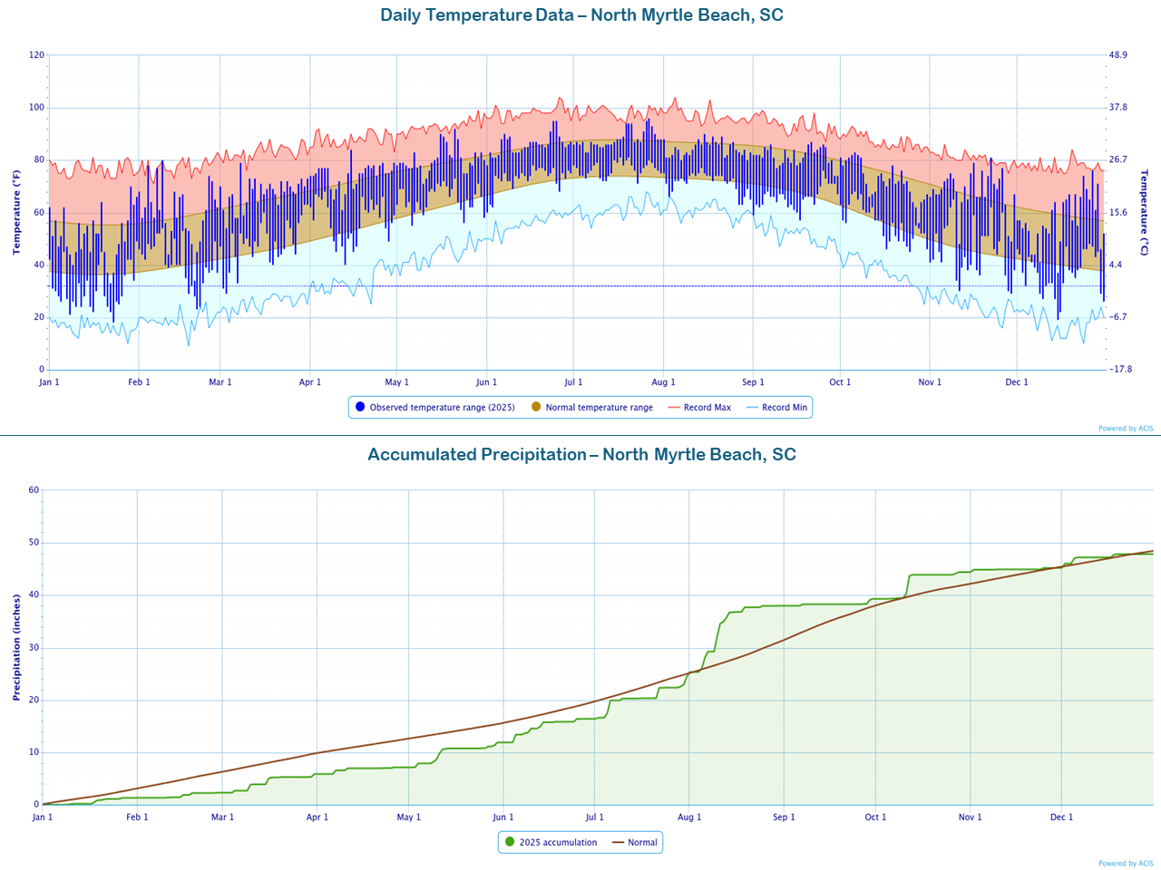 2025 Temperature and Rainfall summary for North Myrtle Beach, SC |