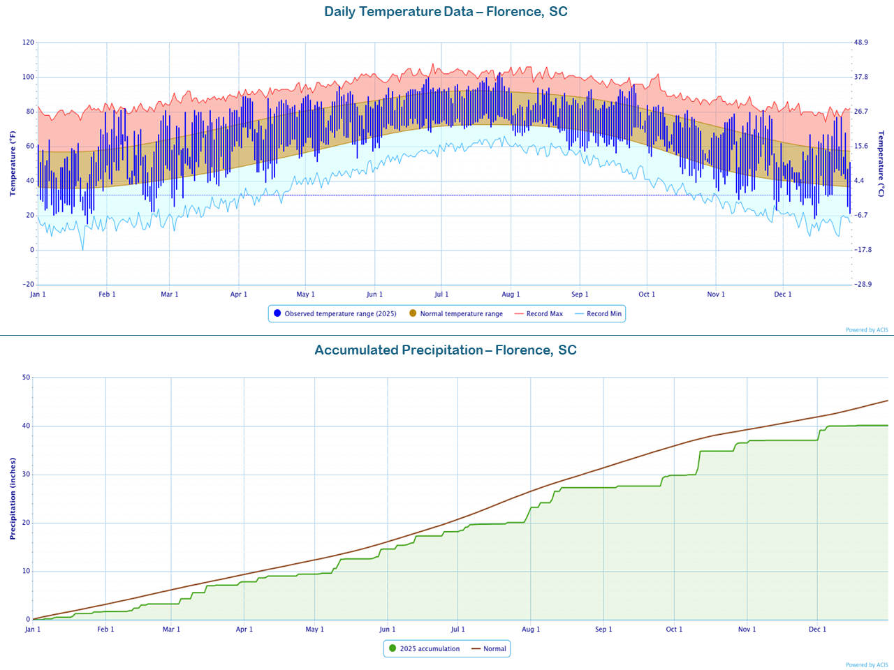 2025 Temperature and Rainfall summary for Lumberton, NC |